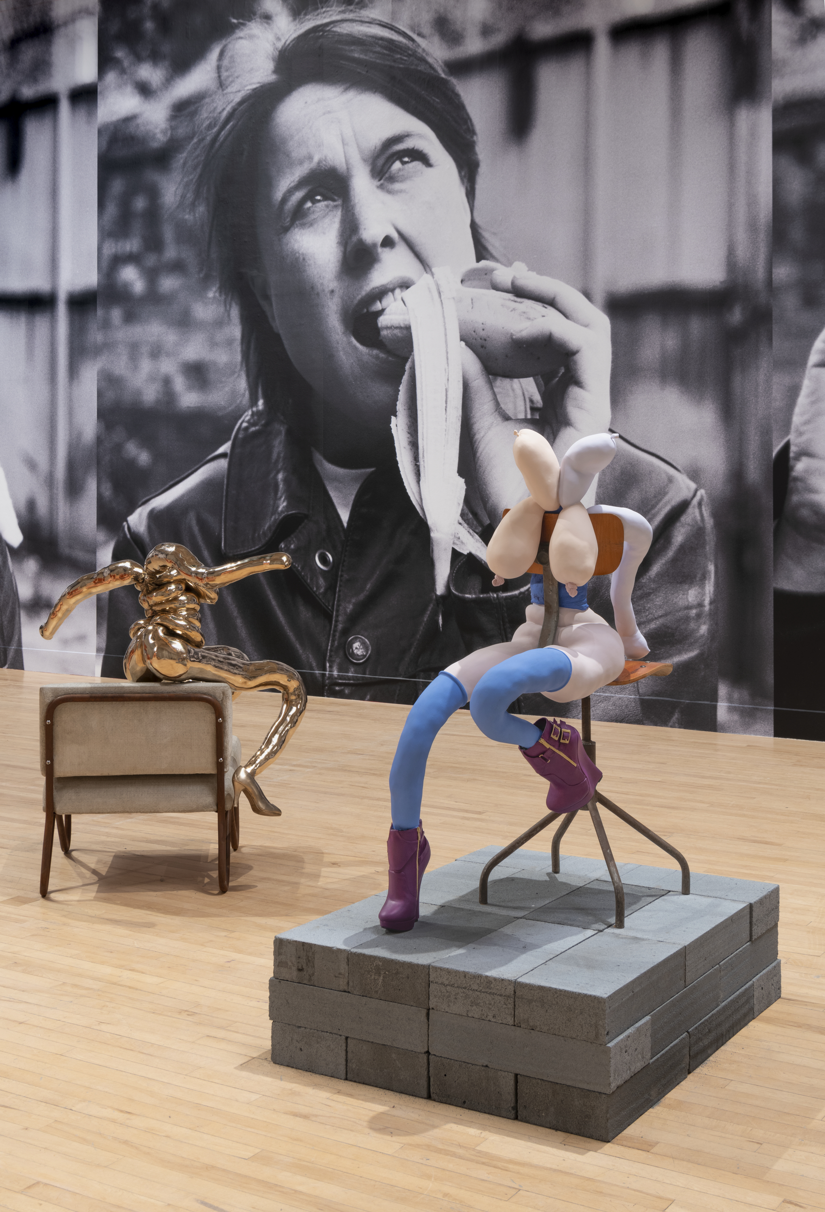 Sarah Lucas, HAPPY GAS, Installation View at Tate Britain, 2023. ZEN LOVESONG, 2023; GODDESS, 2022; Eating a Banana, 1990, Photo: Tate (Lucy Green)