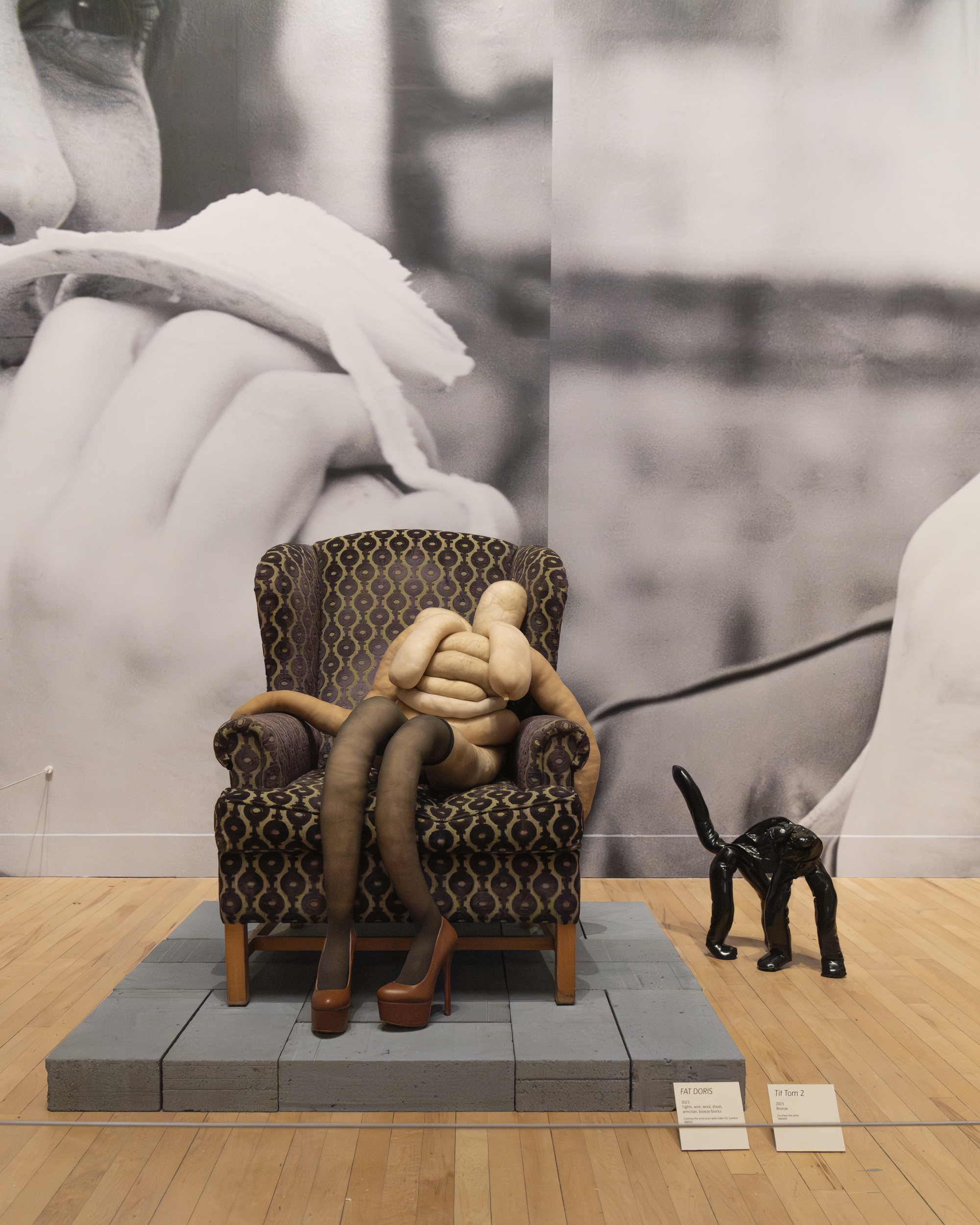 As we transition to the second gallery, we encounter Eating a Banana (1990), which adorns the walls. In this piece, captured from various perspectives by Gary Hume, we observe Lucas in diverse postures while eating a banana. The photographs attain iconic status through the sexual connotations evoked by banana “consumption” and their colossal dimensions. As for the installations centrally positioned in this gallery, we may consider them akin to Bunny (1997). Displayed in a procession-like atmosphere, these bodies generally exude an aura of desire and provocation. Fat Doris (2023) sits confidently in a large throne-like armchair without compromising her sexiness, although she looks tired. The imposition of a standardized beauty ideal is manifest in stockings filled to the brim, contorting literally and figuratively.