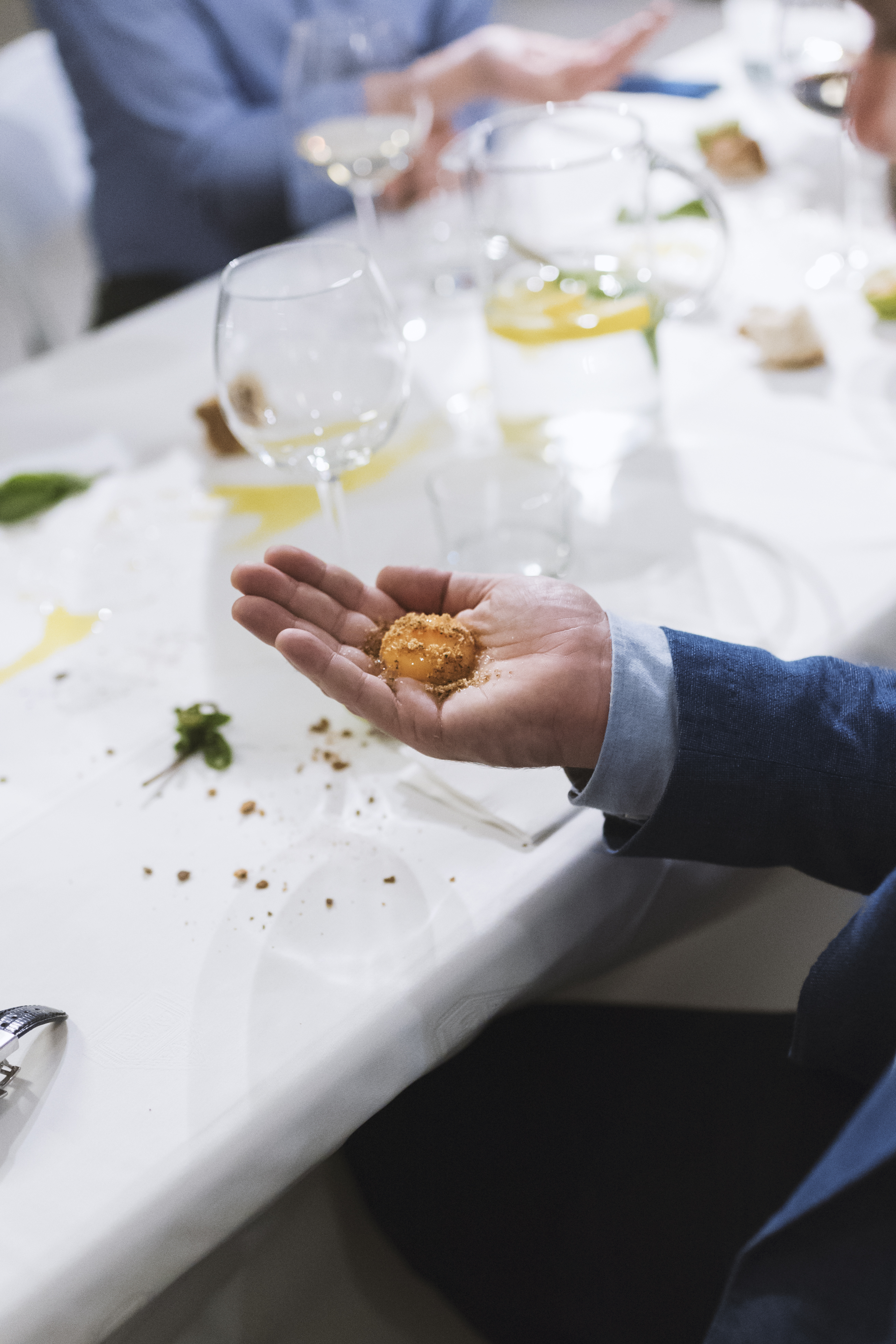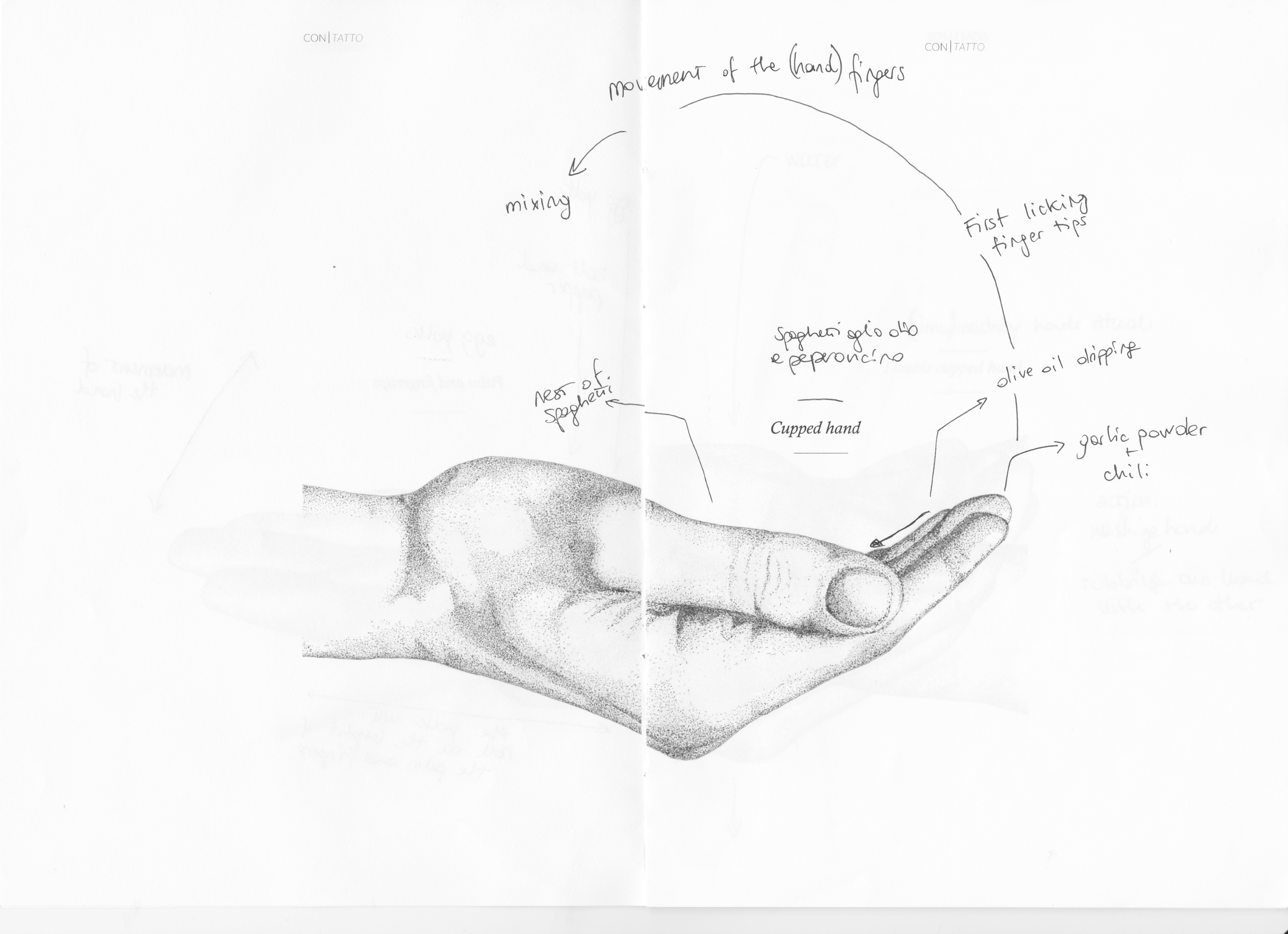 In Contatto Experience, I started by contemplating how to forge a closer connection with what we consume daily. Initially, my exploration focused on the idea of making our hands dirtier during the cooking process. I designed kitchen tools that compelled users to engage with their hands more actively. From there, I delved into the act of eating itself, aiming to utilize our hands in the process. The initial stance in my research was to eliminate any elements creating a distance between ourselves and our bodies, like cutlery or plates. The hands would be the primary tool, supplemented by additional tools where necessary. As I progressed, I realized the profound potential of exploring the physicality of the hand and how it can provoke different sensations based on placement and movement. This led me to design a series of gestures, a sort of choreography inspired by the hand's sensitivity to various textures and temperatures. I drew inspiration not only from the physicality of the hand but also from the characteristics of the ingredients. For example, the viscosity of an egg yolk rolling on the palm or the delicate mixing actions possible with certain textures on the fingertips.