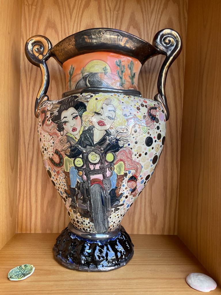 The pillow vases are inspired by the idea is pillow books which were small books of erotica given to young Japanese wives that could be kept under the pillow and were used to arouse sexual interest and ready her for a night of sexual pleasure with her husband. The distance between that and the massive amounts of porn now consumed by mostly men on mobile phones is vast and, in many ways, has an almost inhumane and opposite effect on human sexuality. The things that intrigue us and horrify us all end up in our works. Our workspace is like a laboratory for understanding. We are trying to understand for ourselves first and the end manifestations hopefully hold deep truths for others to understand as well.