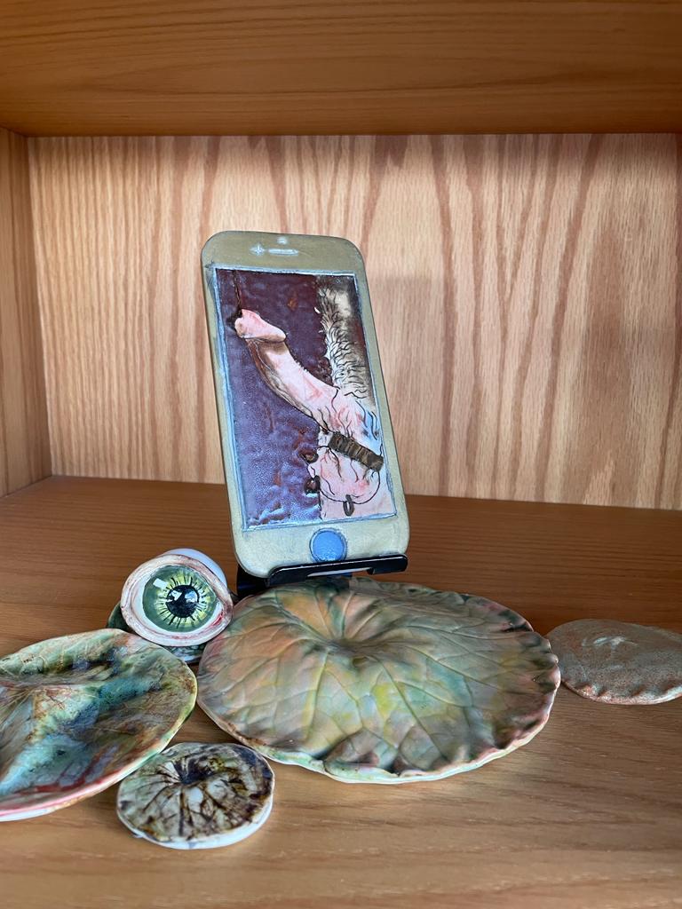 Skuja Braden, Open Closet, 2023, porcelain, mixed technique, Installation view of the exhibitionA certain inclination towards incorporating daily objects into your aesthetics is also visible throughout the show. I think the mobile phone figurine and the pillow vase are the most striking examples in this context. How do you choose such daily objects?