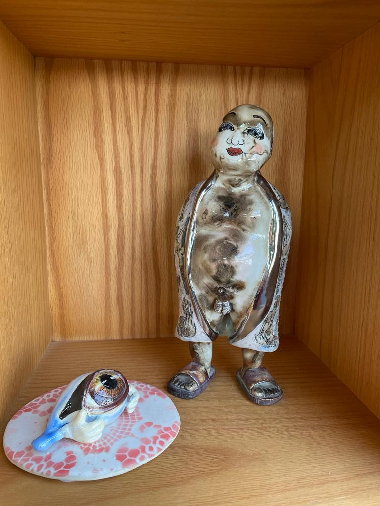 Skuja Braden, Open Closet, 2023, porcelain, mixed technique, Installation view of the exhibitionThere are many figurines in the show, all adding new layers to your presentation. The eye figurines reminded me of Georges Bataille’s Story of the Eye in which fetishism and unrestrained sexuality are meshed with a dramatic narrative. What were the theoretical and literary sources you drew upon for this exhibition?