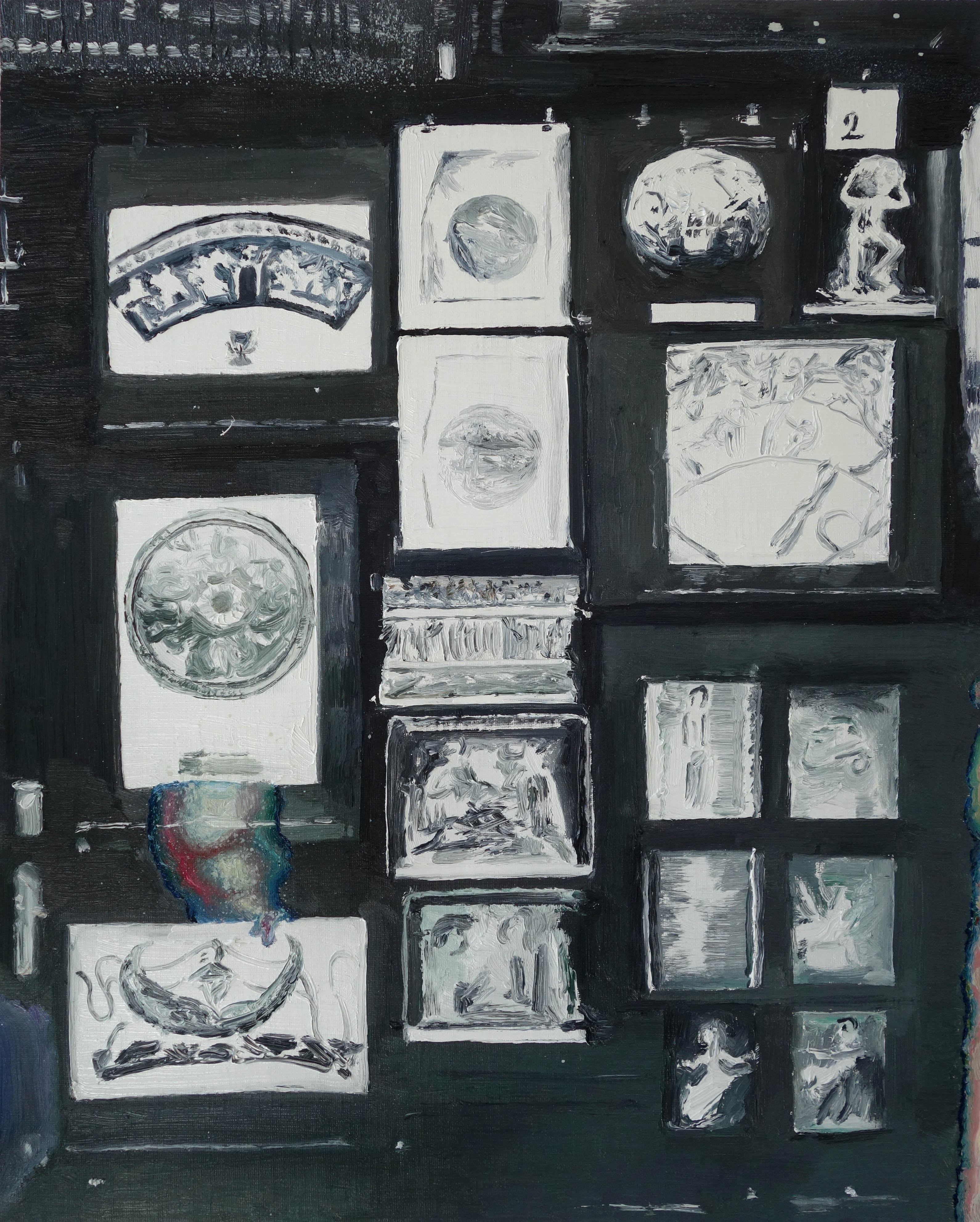 Plate 2 - A.W., a painting after Aby Warburg's plate, which opens and closes the exhibition, is programmatic of the links, connections and formal rebounds between the paintings in the show.