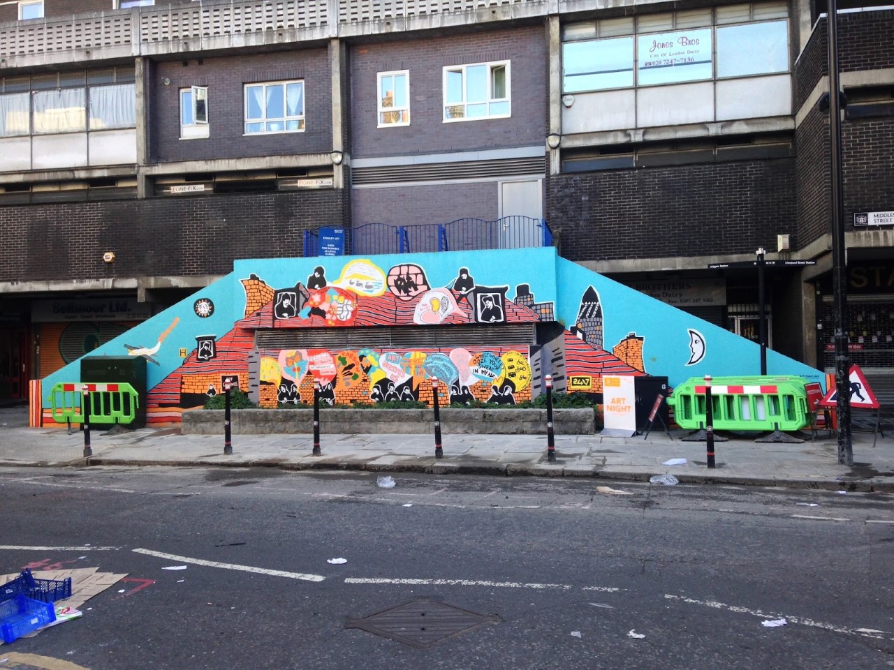 Güneş Terkol, Evim kalbimdir, 2017, kalıcı duvar resmi, 14 x 4 m, Art Night / Londra, İngiltereLondra Mimarlar Birliği’nin 1970'lerde göçmen işçiler için inşaa ettiği, içinde oyun alanlarının, dikiş odasının ve konut sakinlerinin düzenlediği bir bahçenin olduğu, 270 mülkü içinde barındıran, şehrin tam merkezindeki bir sosyal konutta, Middlesex Street Estate’te bir ay boyunca kaldım ve araştırmalarımı yaptım. Bu süre zarfında, çoğu başka Avrupa ülkelerinden çalışmak üzere İngiltere’ye göç etmiş, kadın katılımcıların yoğunlukta olduğu bir grupla toplantılar düzenledim. Kentsel dönüşümün hızla yok ettiği, tarihin yanısıra şehirde bir kadın olarak yaşamanın gerçekliklerine, katılımcıların şehre dair şikayet ve taleplerine odaklandık. Konutun arka bölümündeki 12 metreye 4 metrelik duvara ise düzenlediğim atölyelerin sonucunda çıkacak görseli aktarmak üzere izinlerimizi alıp hazırlıklarımızı yaptık. Art Night gecesi atölye katılımcıları ile birlikte beraber oluşturduğumuz pankartla dışarı, sokağa çıkıp, tabelalara çarpa çarpa, şehrin trafiği içinde bir saat boyunca yürüdük. Kuş düdüklerimizle kuş bandosu olarak bir performans yaptık ve bir piknik alanında yürüyüşümüzü sonlandırıp birlikte geçirdiğimiz süreci ve yaşadıklarımızı paylaştık.
