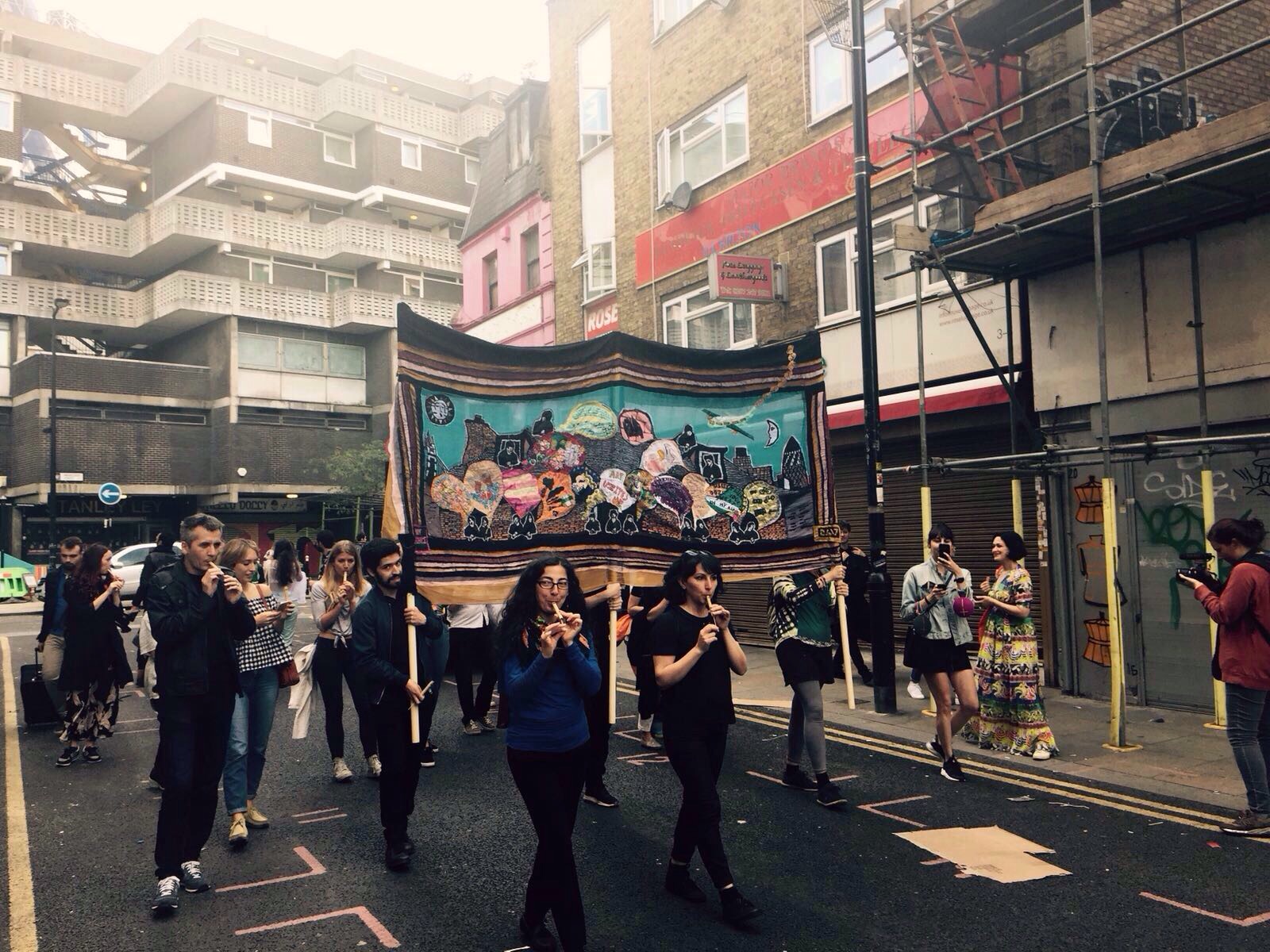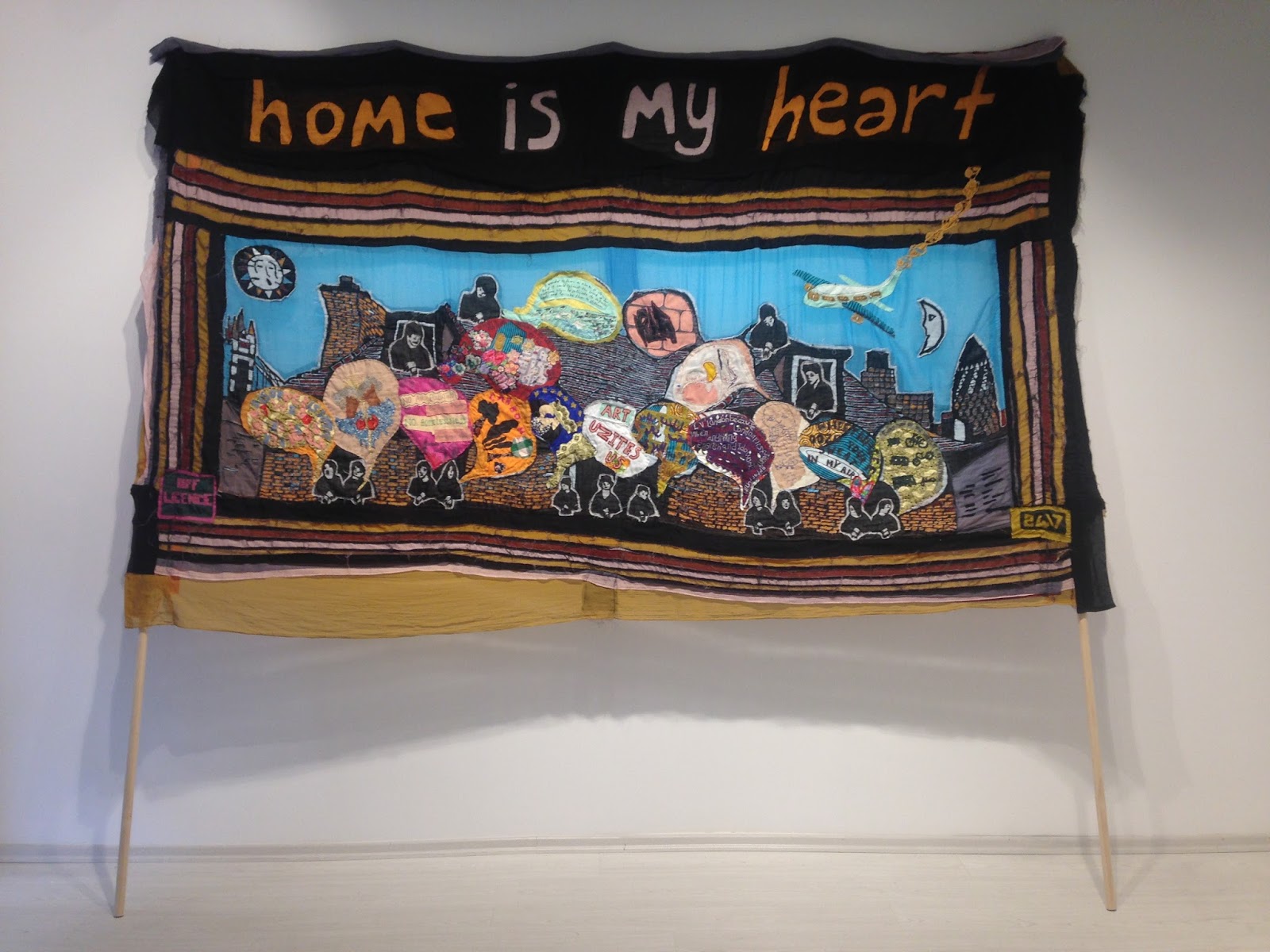 Güneş Terkol, Evim kalbimdir, 2017, kumaş üzerine dikiş, 200 x 300 cmBu bir aya yayılan sürecin sonunda bir projeyi tamamlayıp ya da bir resmi yapıp duvara asmaktan ziyade, onu dışarı taşımak, sesiyle, performansıyla, duvar resmiyle şehre sızabildiğini, daha geniş bir alana yayılabildiğini görmek benim için hem çok tatmin edici ve ilham verici hem de zihin açıcı oldu. Atölyelerde pekçok hikâye dinliyorum, tanıklık ediyorum; katılımcılarla paylaştıklarımız, aramızda oluşan ilişki kendi bireysel çalışmalarımda dışarı çıkıyor, kendi yansımalarını buluyor. Başkalarının hikâyeleri üzerinden kendimi görmeye başlıyorum. Düzenlediğim her atölyenin öğretici yanı ve bana yeni ufuklar açan bir niteliği oluyor. Fakat Evim Kalbimdir daha katmanlı bir düşünce ve hazırlık safhasına sahip olduğu ve kamusal alana taşabildiği için diğer işlerimden ayrılıyor. 2010’da bu atölyeleri başlatmama vesile olan şehre yedi sene sonra dönüp Londra sokaklarında pankartımızla yürümek, başta karşılaştığım nakışlı pankartların ve arşivin adeta bir izdüşümü gibi oldu.”