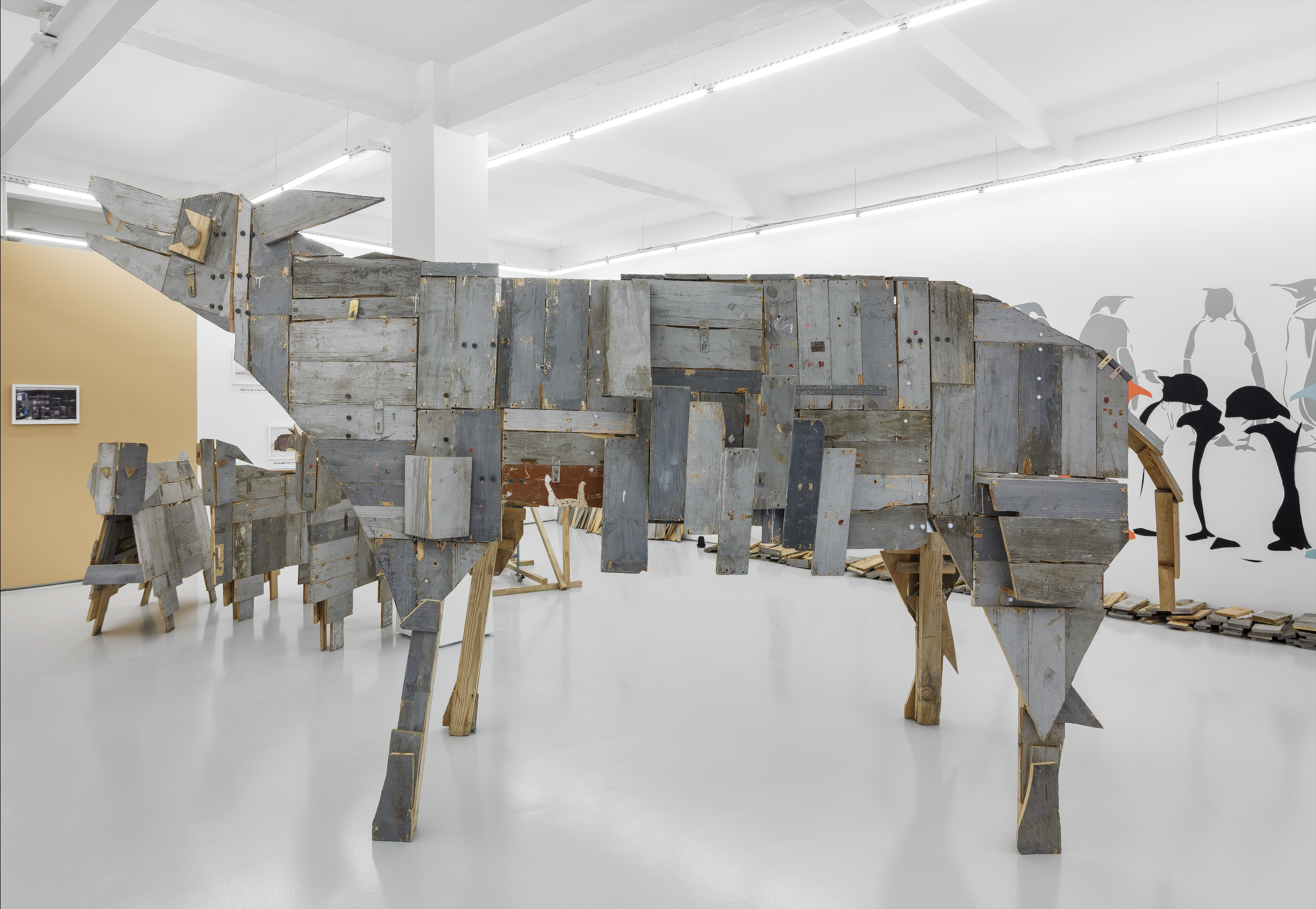 FÖ: Buluntu nesneyi bir zehir metaforu olarak düşünebilirim önerin üzerine. Beni öteden beri buluntu malzemelere yönelten şey Duchamp’ın 1913’te ortaya attığı o zehirleyici soruda: “Sanat olmayan yapıtlar yaratılabilir mi?” Buluntu olan aynı zamanda canlı olana denk geliyor ve içlerinde hakikati saklıyorlar. Artık kullanım dışı kalmış ahşap seçim sandıklarından yaratacağım formlar, sandıktan demokrasinin çıkmadığı hakikatine işaret edeceklerdi. Seçim sonucundaki gerçekle sandıktaki hakikat farklıydı. Yüzün üzerindeki sandıkları tek tek parçalamak gerçeği de parçalamak anlamına geliyordu benim için. Çıkan çiviler, menteşeler, vidalar bile bir bedenin öteki organları olarak mekânda görünmeliydiler. Seçim sonucunda önümüze sürülen gerçek; paranın, med- yanın, kamuoyu araştırmalarının ve lisansız yazılım programlarının yarattığı bir gerçek olarak sandıktaki hakikate ters düşüyordu. Ancak ben tüm sergiye yayılan bu buluntu nesnelerle Türkiye ve Avrupa’da yakın dönemlerde hızla yükselişe geçen milliyetçilik ve muhafazakârlık olgularına da işaret etmek iste- dim. Büyük kurt formu bu milliyetçiliği simgelerken kuzular azınlığa ilişkindi. Çoğunluğun seçimi kazananın seçimiydi ancak herkesin değil. Demokrasi işte tam da o noktada kaybeden azınlıkların taleplerini yerine getirebilme gücünü gösterebilmek anlamını taşıyordu. Mesele özgürlüğü tüm bu zeminlere yayabil- memizdi. Bilmiyorum buluntu nesneler olarak bu sandık yığınlarını bir depoda görür görmez bahsettiğimiz “karanlık madde” beni de kuşatmış olabilir.