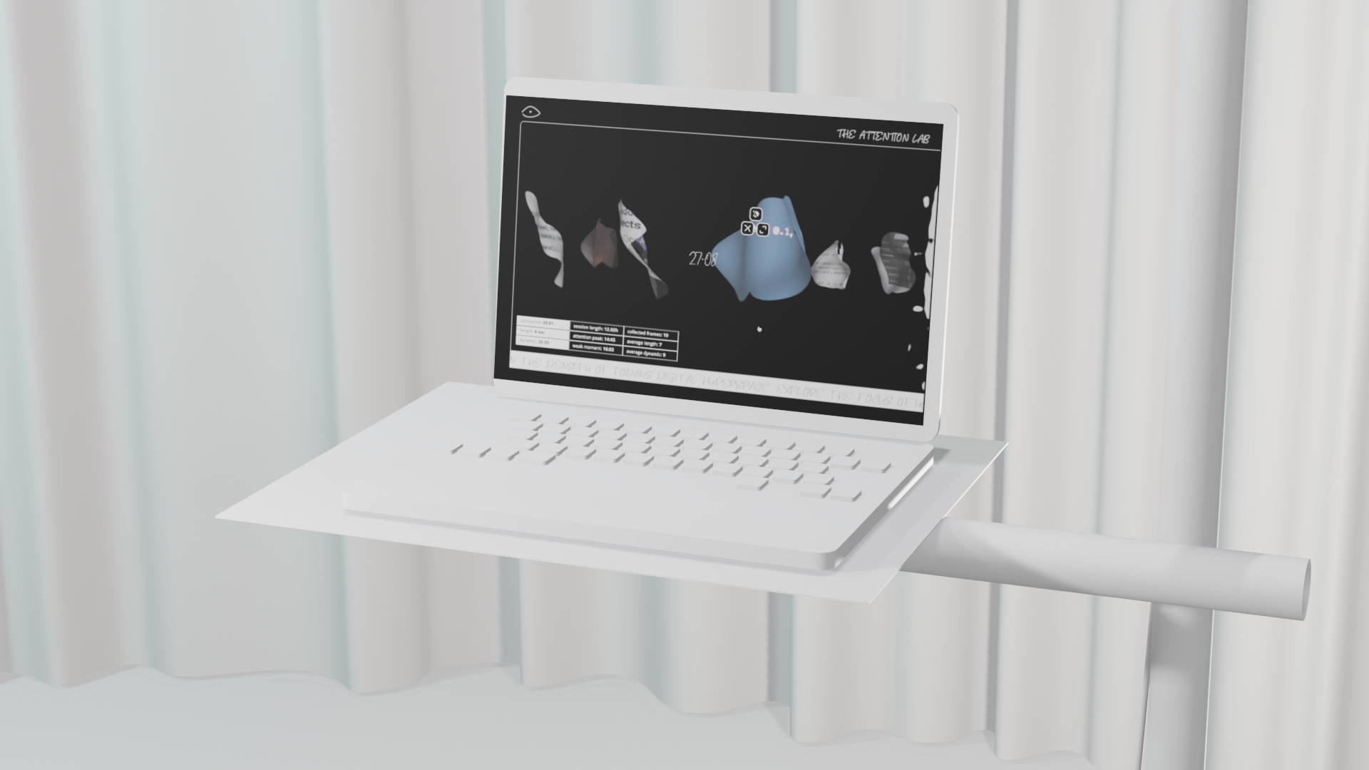 The attention lab adlı projeme bu olguyu göz önünde tutarak başladım. The attention lab’in amacı sürekli daha çok, daha da çok bilgi arayışında olmak ve tüm bu veriler arasında kaybolmak yerine, zaten ilginç bulduğumuz şeylerin neler olduğuna dönüp bakmak. O bilgi üzerine düşünmek, derinlemesine kafa yormak ve onu başka perspektiflerden görmek. Bilgisayarınızda, sizin en öne çıkan bilişsel tepkilerinizi ve kişisel ilgi alanlarınızı ortaya çıkaran görsel optik tepki anlarının verisini toplamak için göz hareketlerinizi tarayan, göz izleme tekniklerini kullanan bir program olduğunu düşünün. Bakışlarınızın düzensiz sabitleşme noktaları, seçici algınızın temel niteliği, kısaca söylemek gerekirse dikkatinizi en uzun süre çeken şeyler üzerine çalışan bir program. Bu programın bütün bu optik tepki anlarını onların arkasındaki teknik bilgiyle birlikte sizden parçalar olarak topladığını düşünün.