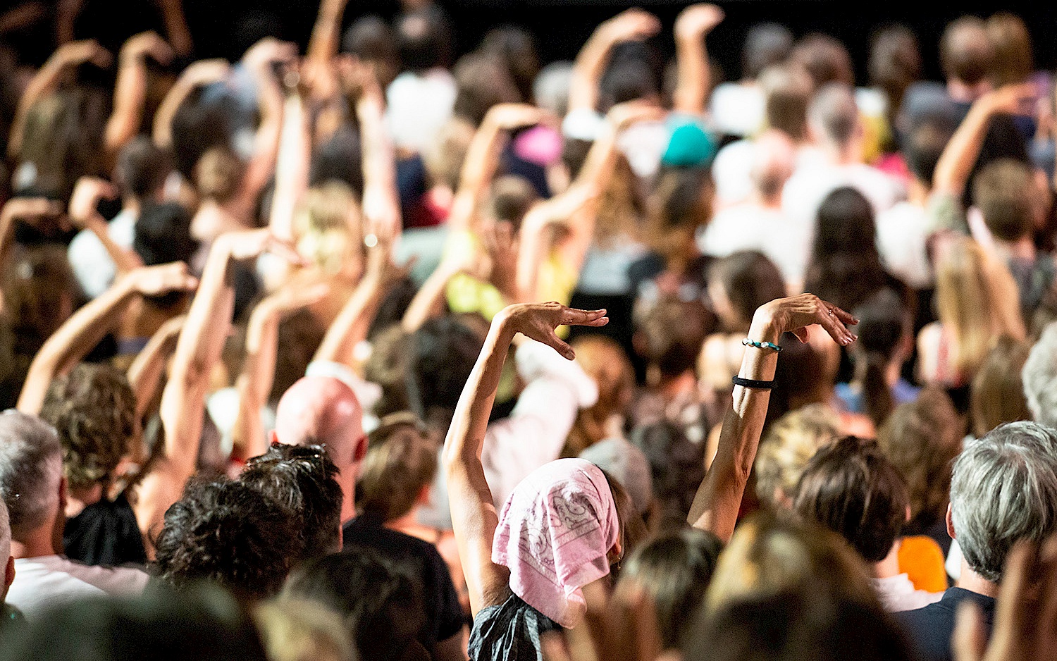 Spiegelneuronen, Fotoğraf: Bernd UhligBir yandan Tobias Koch’un bazen arka plan oluşturan bazen ritimleriyle yerimizde durdurmayan atmosferik müziği eşliğinde ve Martin Hauk’un gösterideki her fikrin altını sakince çizen ışığı altında eğleniyoruz. Bir anda nerden çıktıklarını anlamadığımız sarı balonları şişirip birbirimize atıyoruz, ortalık kindergarten’a yani bir çocuk yuvasına dönüyor, bir yandan da -belki daha önce bilmediğimiz veya üzerinde etraflıca düşünmeden icra ettiğimiz- gündelik davranış tercihlerimiz hakkında bilgileniyoruz. Örneğin; birinin bize yaklaşmasına ne kadar izin vereceğimiz konusunda her zaman bedenlerimizle pazarlık yapıyor olmamız. Üst ses sonraki sekansta tam da buradan yürüyor. Az önce aramızda ortak hareketlere katılmayıp öylece kollarını kavuşturmuş oturan insanların da olabilme olasılığını bile tahmin ederek dillendirmiş olmaktan çekinmeyip, çıtayı Orta Avrupa seyircisi için bir derece daha yükseltiyor ve yanımızdakinin omuzuna dokunmamızı, biraz sonra da etrafımızdakilerle el ele tutuşmamızı öneriyor. Berlin’in her şeye açık ve teşne seyircisi ikiletmiyor, bir anda seyirci tribününde koltuk sıralarını aşan bağlar oluşuyor. Sonlara doğru Sasha Waltz’in dansçıları da anonimliklerinden iyice sıyrılıp, çok da bir parıltısı olmayan bir koreografi eşliğinde bulundukları farklı noktalardan birbirleriyle bağlar kurmak üzere yavaş çekim hareketlerle bir araya gelecekler.