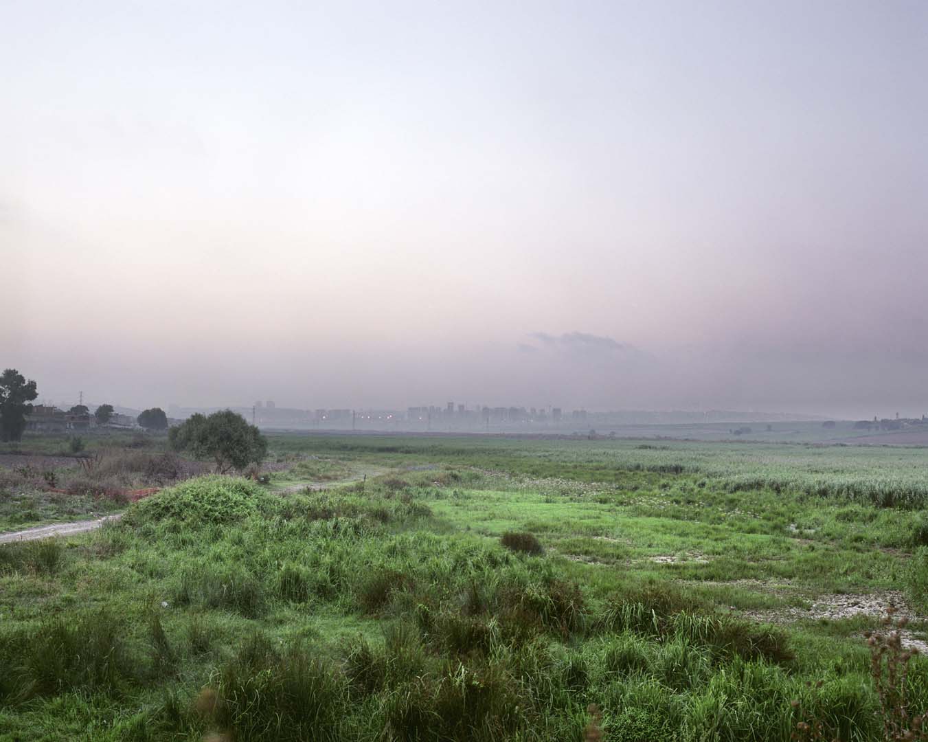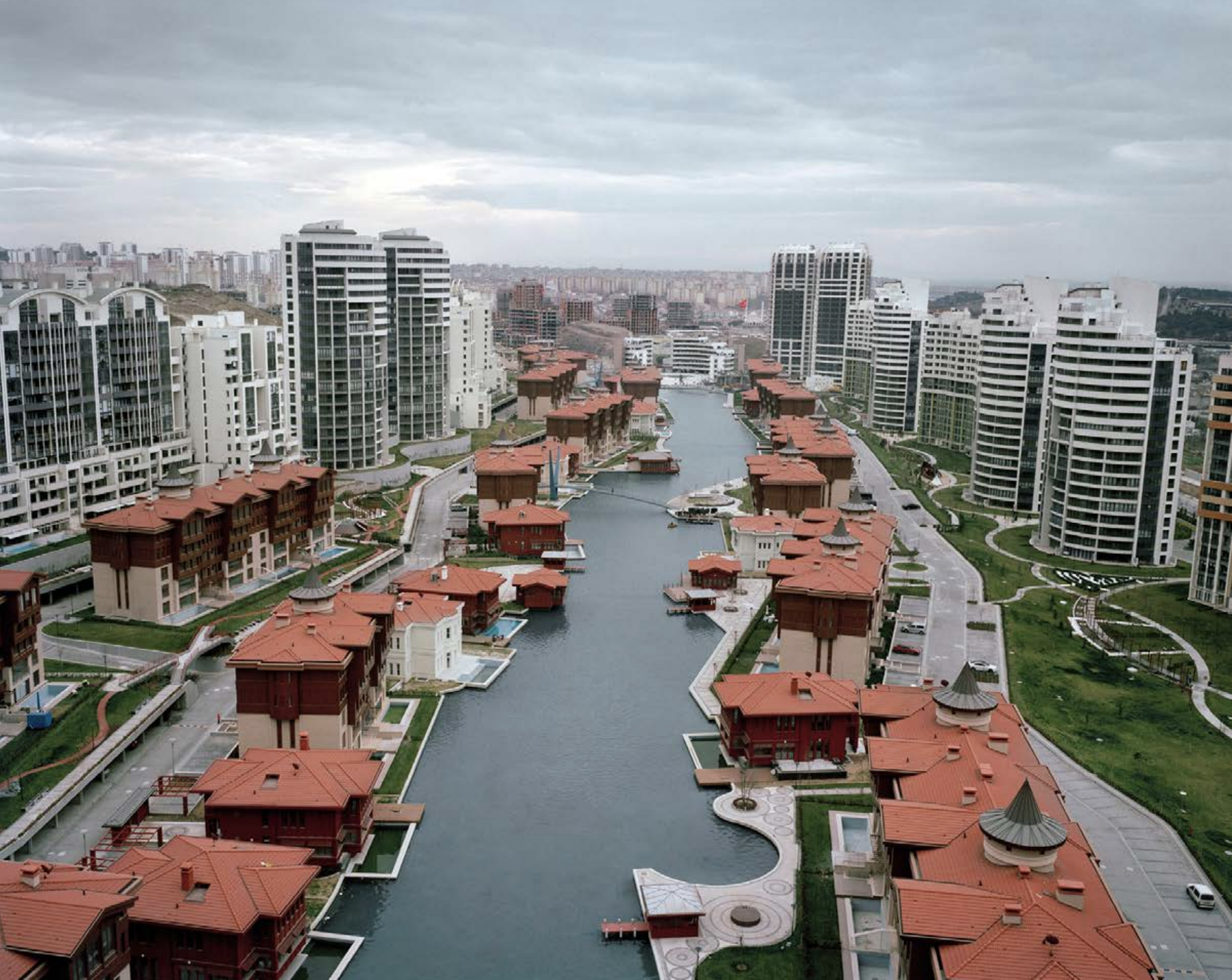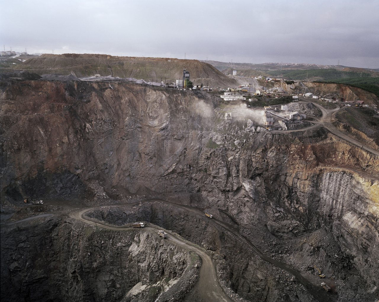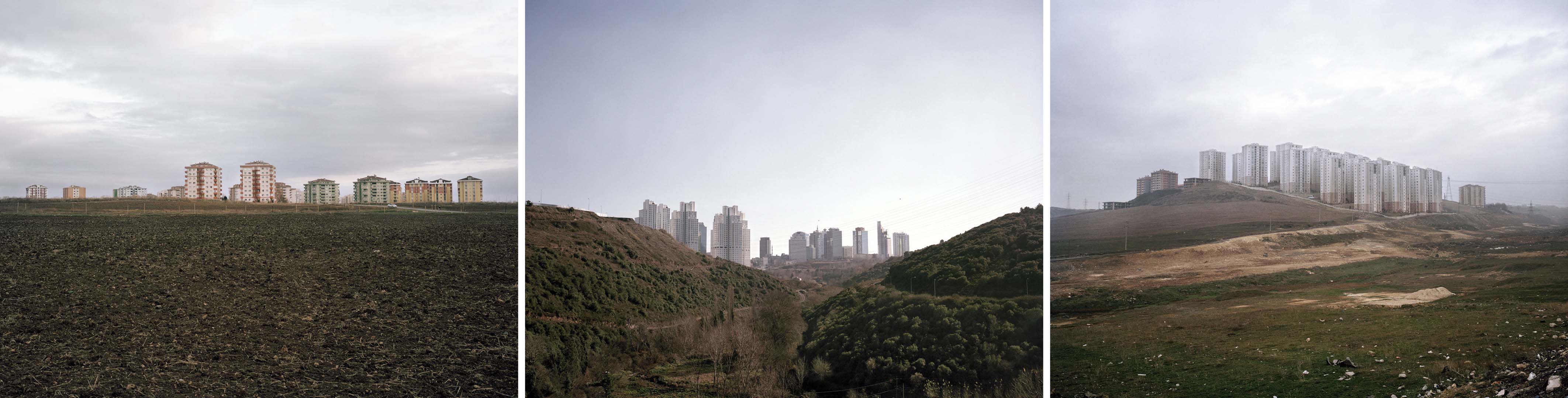 Serkan Taycan, Kabuk #6: Sultangazi, 2012, Arşivsel pigment baskı, 110x138 cmSütçünün yanı başından ayrılıp, şehre doğru ilerledikçe, hafriyat kamyonlarına gizlenip, reklam panolarında makyajlanarak sunulan yapılaşmanın arkasında yatan hastalıklı sistem de ifşa oluyor. Şehrin kuzeyindeki yerleşmeleri birer hafriyat çöplüğüne çeviren bu sistem, bugüne kadar tarih kitaplarından, ressamlardan, Matrakçı Nasuh’un minyatürlerinden aşina olduğumuz incelikli İstanbul panoramasının, metan gazı soluyan “modern” etiketli halinde ete kemiğe bürünüyor. Bu yeni şehir panoraması, şehrin her yerinden gelen çöplerin bir arada tutulduğu Halkalı çöplüğünden başkası değil. Şehrin bugününe dair pek çok veriyi aynı anda sunan bu engin manzaranın hemen karşısında, aynı çöplüğün üzerine kondurulmuş, kent dokusuna protez kalan yapısıyla ikonikleşen Bosphorus City projesinin vaat ettiği “yeni yaşam” anlayışıyla karşılaşıyoruz. Bu anlayış çeperlerde o kadar yaygın ki, şehrin yeni panoraması gibi hemen üstünüze siniveriyor.