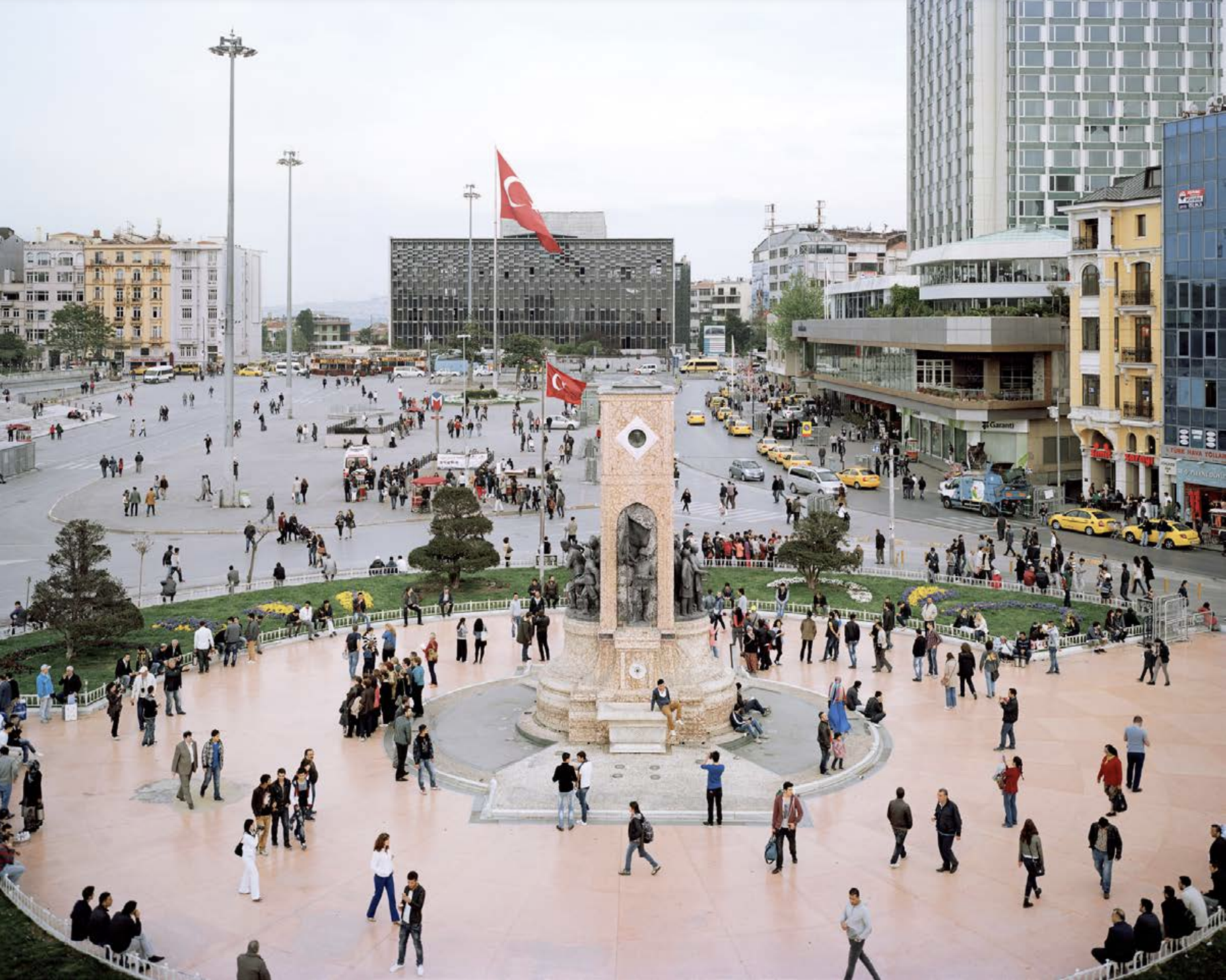 Serkan Taycan, Kabuk #5: Halkalı, 2012, Arşivsel pigment baskı, 110x138 cmSütçüyü anlayışla karşılamış, muhtemelen yoldan geçen hafriyat kamyonlarına “cık cık”lamış, üstümüz başımız kokmuş ve göz zevkimizden olmuş bir halde, şehrin biricik meydanlarına varıyoruz. Yegâne “klimalı” buluşma noktaları olarak, “kamusal alan” tanımına yeni bir boyut katan alışveriş merkezlerinin de dahil olduğu “meydanlar”, görselleriyle, dolar kurundan, kendi sosyo-politik gündemine kadar pek çok detayı bir arada sunuyor. Erk olanın iradesine göre sürekli dönüşmekten kimlik karmaşasına teslim olan bu alanlarda biz tabii ki yine toplanıp yüksek sesle bir şeyler söyleyemiyoruz; oturuyor, kuş besliyor ya da birileriyle buluşuyoruz işte.