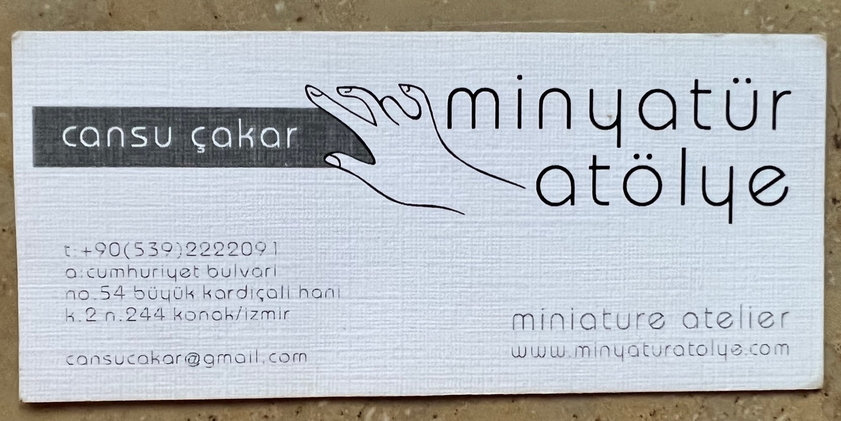 Mezun olan her güzel sanatlar öğrencisinin hayalidir bir atölye tutmak. Bu konuda öğrencilik yıllarımda tanıştığım K2 Çağdaş Sanat Derneği ile yollarımızın kesişmesini bir şans bilirim. O zamanlar cüzi kiralara atölye kiralayabildiği miz evimiz gibiydi Büyük Kardıçalı Han. Üzerine düşündüğüm minyatür sanatı gibi minik mi minik bir atölyem vardı. Cezaevi sergisini düzenledikten sonra ikna olmuştum kendi kendime insanlara minyatür öğretebileceğime. Amacım atölyemde özel dersler vererek atölyenin masraflarını karşılamak ve pratiğimi devam ettirmekti. O yüzden yaptım kartviziti.