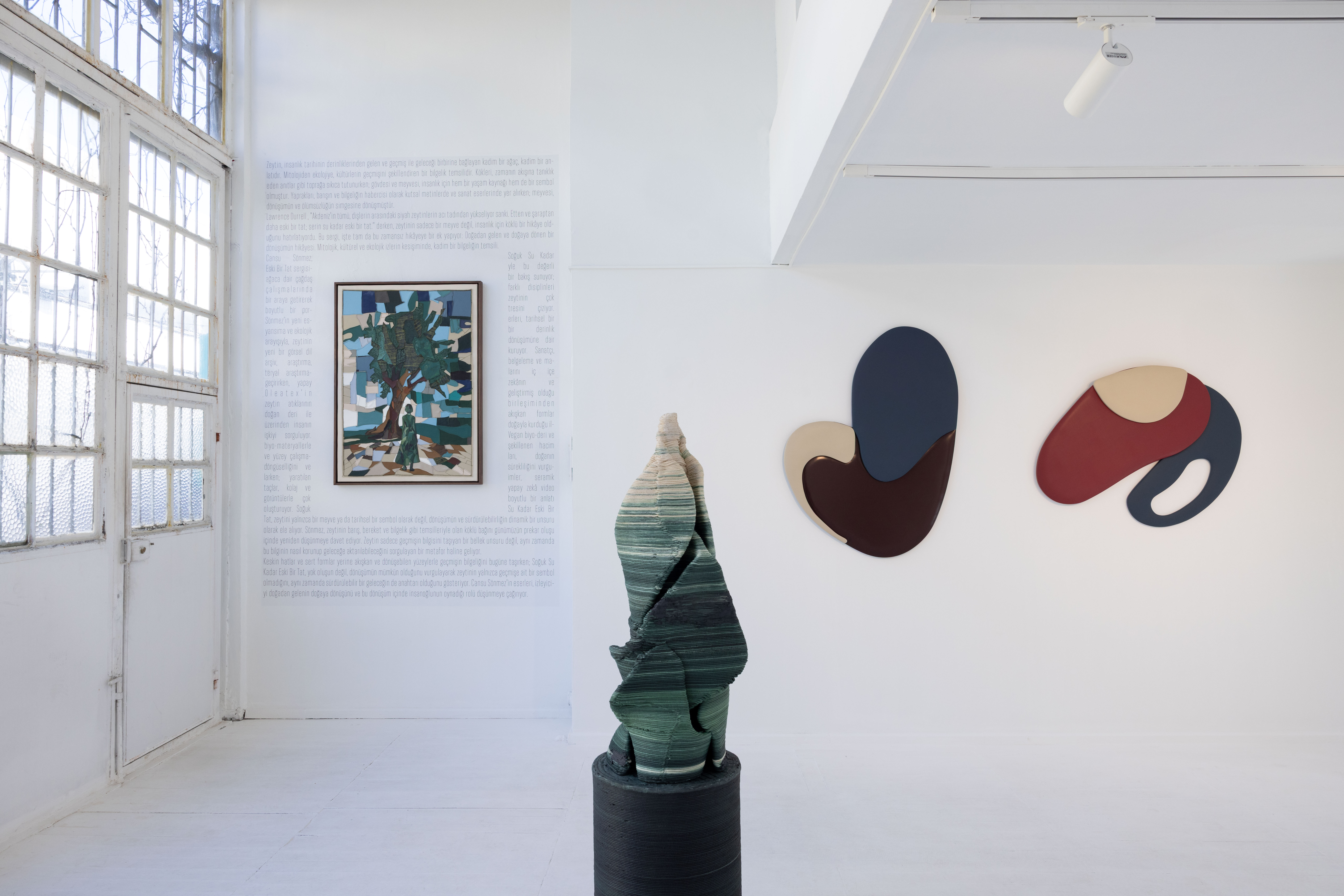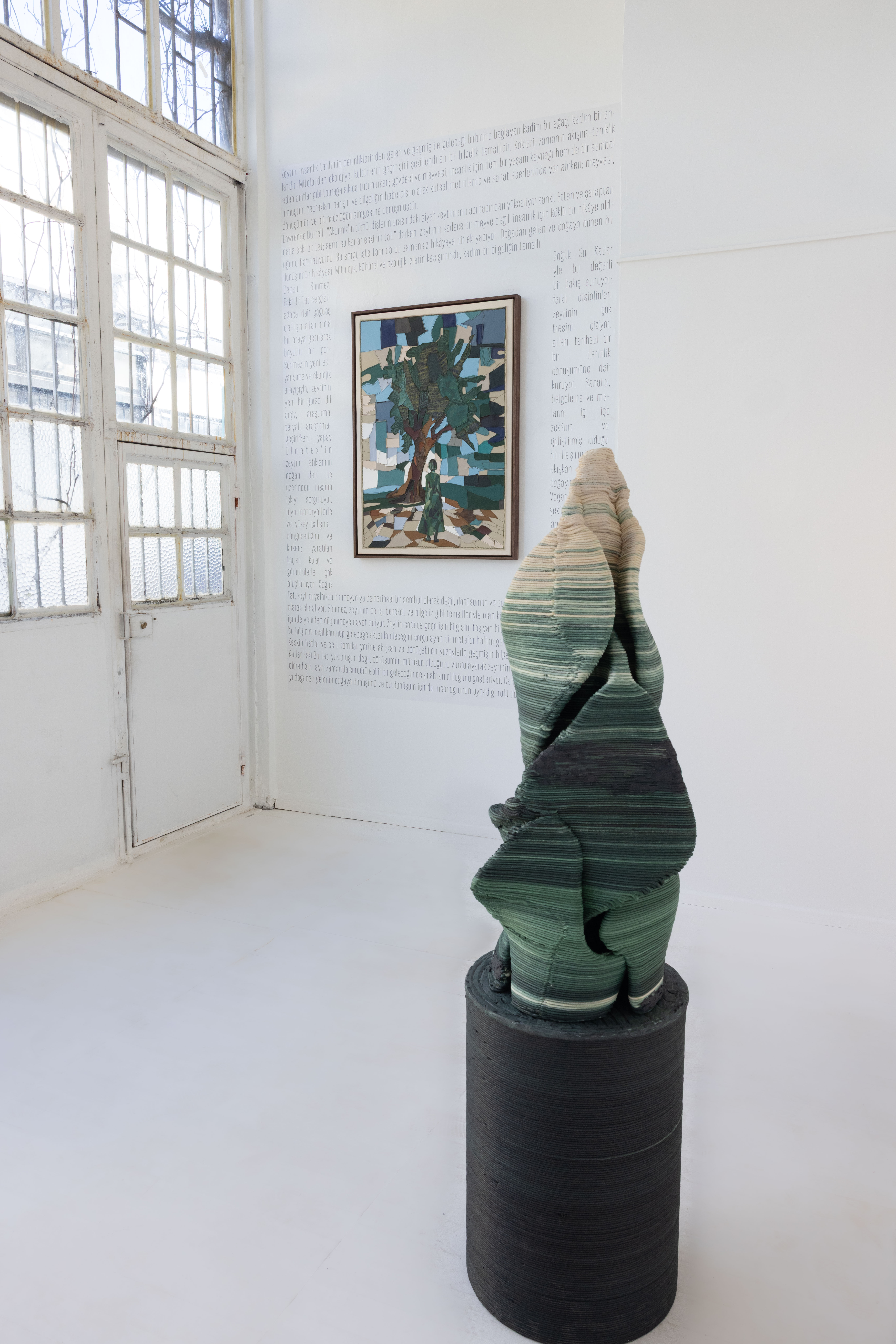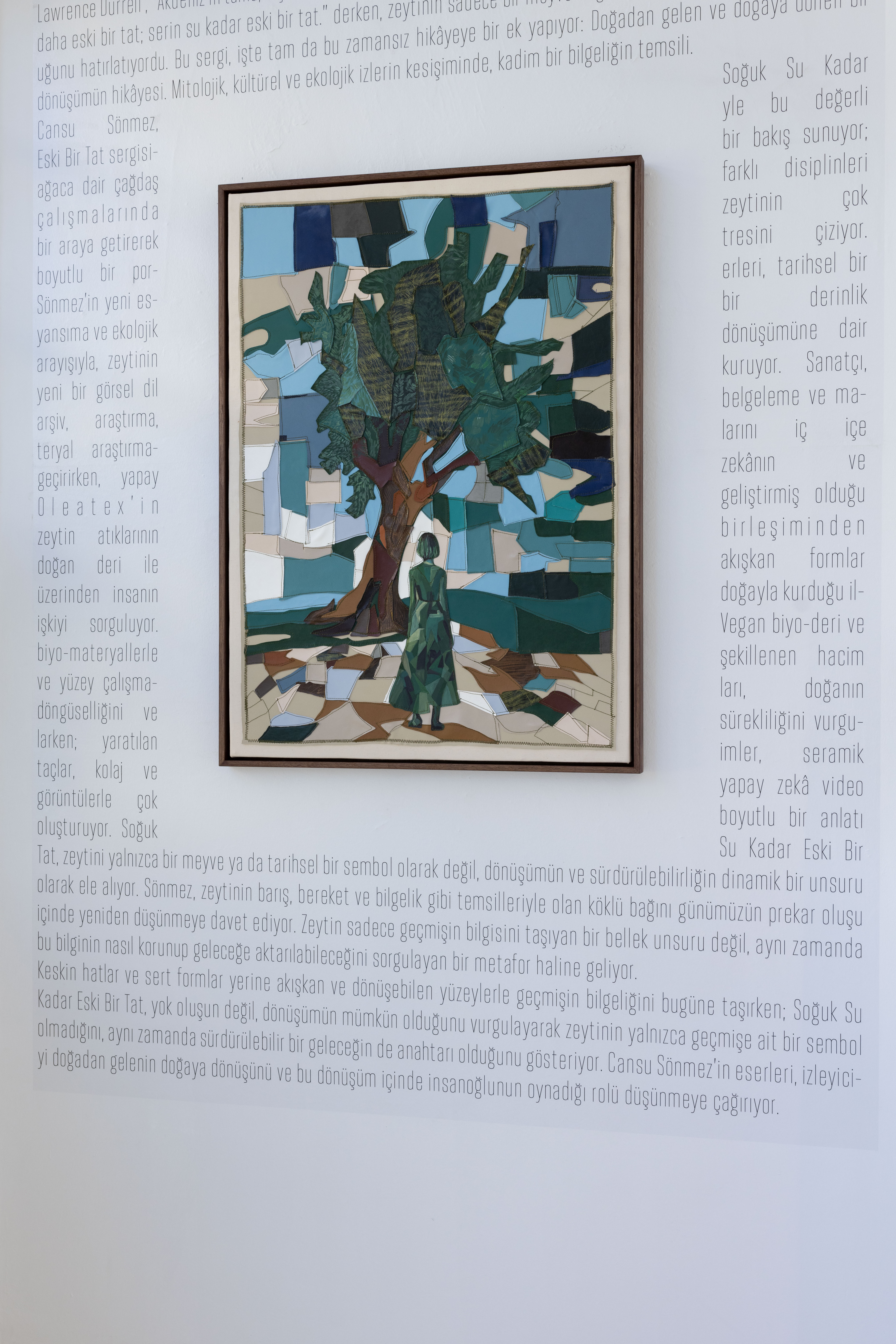 Sergi başlığını Lawrence Durrell’in Akdeniz’i tarif ederken kullandığı “soğuk su kadar eski bir tat” ifadesinden ödünç alırken, yalnızca bir coğrafyayı değil; zamanın, belleğin ve duyumsamanın kesişim noktası haline geliyor. Zeytin ağacı ve su gibi kadim unsurlar, Cansu Sönmez’in pratiğinde bugünün ekolojik ve düşünsel bağlamlarıyla yeniden örülüyor. Başka bir deyişle, doğayla insan arasında kurulan tarihsel bir ilişkinin izlerini taşırken, aynı zamanda bugüne ve geleceğe dönük bir bakmak da mümkün. Sergi böylece, geçmişin kadim izlerini bugünün çağdaş diliyle birleştiriyor; hafızayı hem kişisel hem ekolojik bir mesele olarak yeniden düşünmeye çağırıyor.