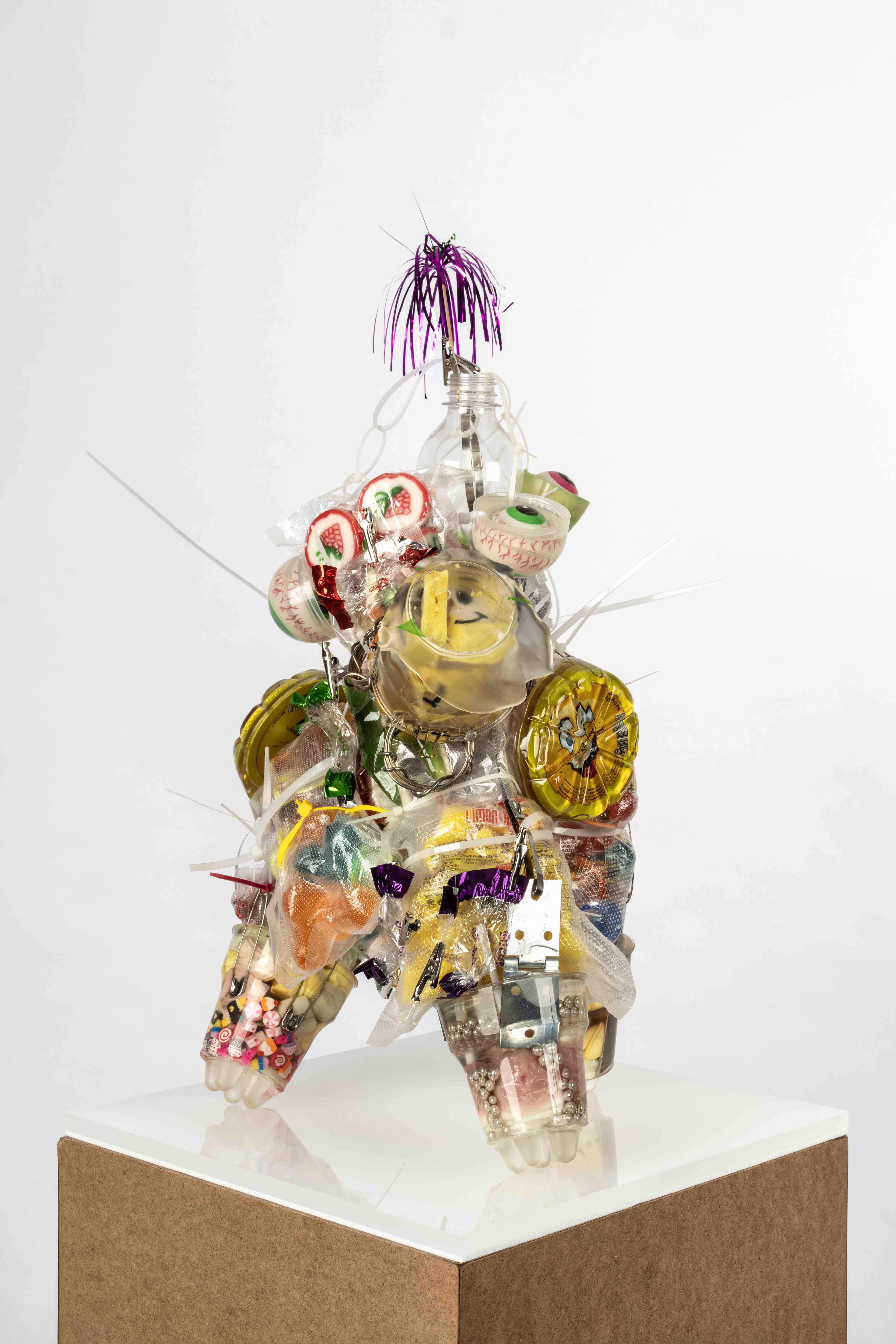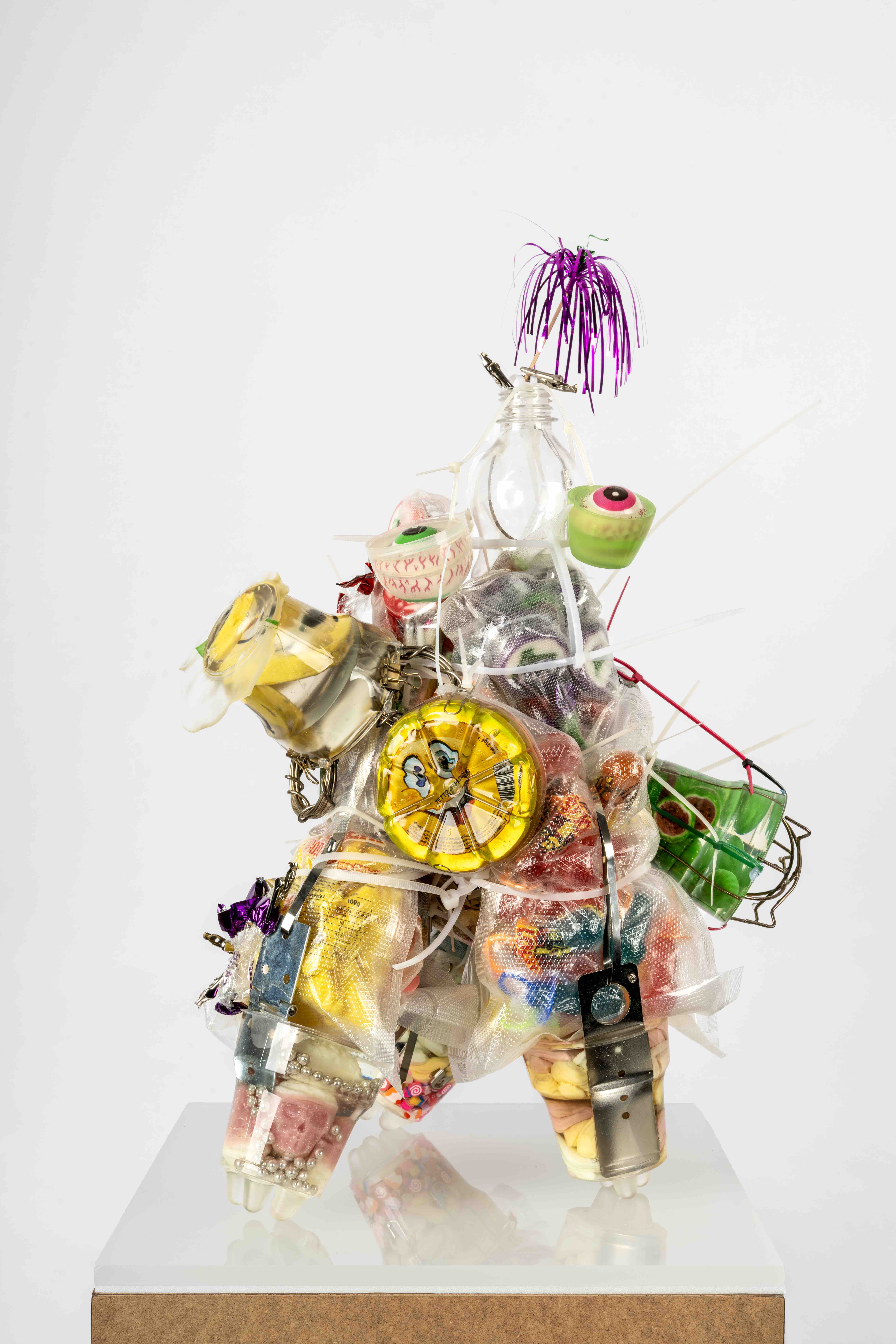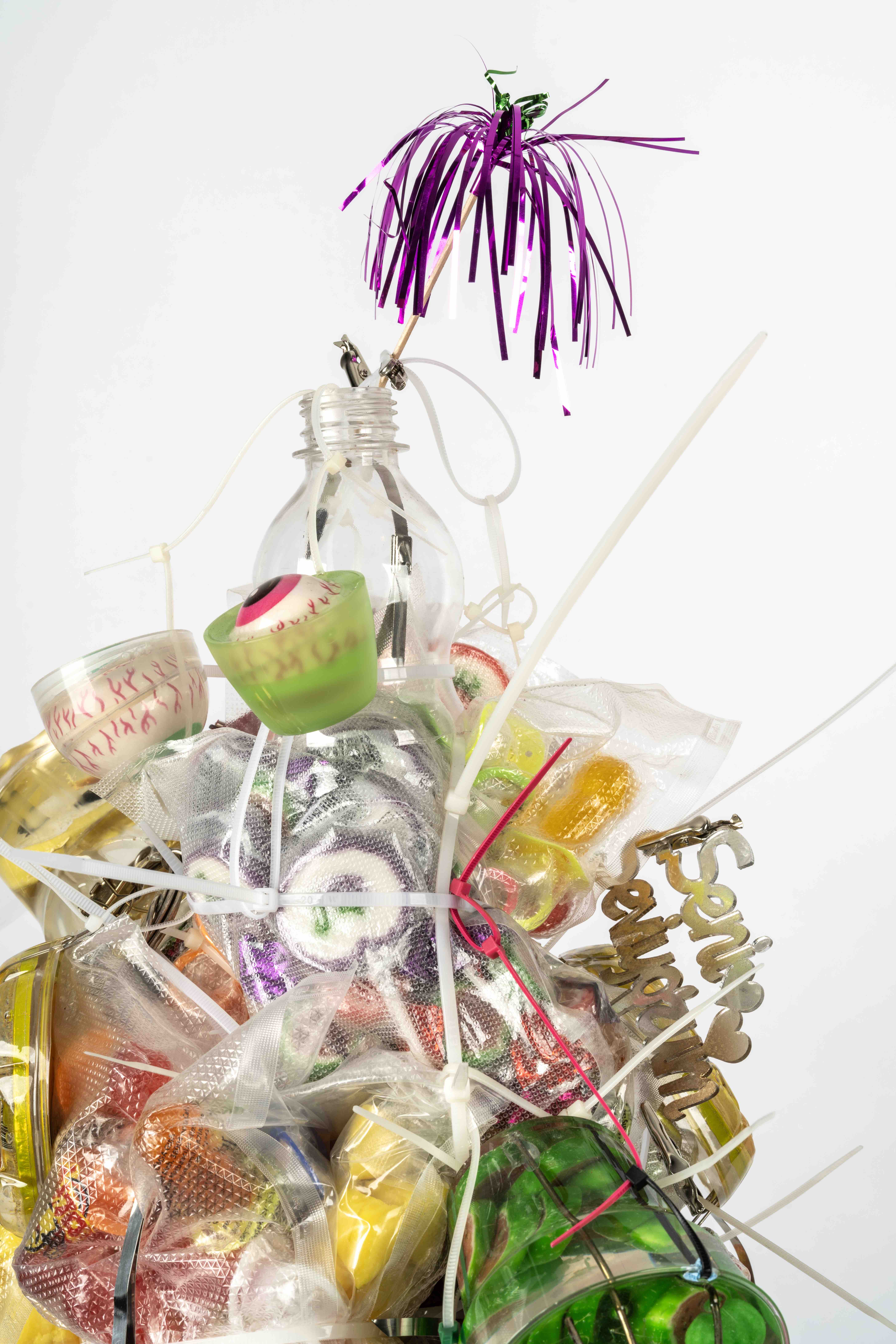 Irmak Canevi, Tatlısın, 2024, Vakumlanmış şeker, çikolata, reçine, plastik, çelik, kablo bağı, kokteyl kürdan süsüAralıktan Seksek bir karnaval ve kalbinde de adi sınai nesneler var. Hani gündelik hayatta karşılaştığımızda çoğu kez fabrikadan henüz çıkmış olan, tam da ihtiyacımız olduğunda elimizin altında hazır ve nazır bulunan, işini sessiz sedasız gören ve çabucak da çöpe atılan, pek az ihtimam gösterdiğimiz, hiçbirimizin ardından yas tutmadığı, ne maddi ne manevi herhangi bir değere sahip nesneler. Plastik pipetler, strafor bardaklar, pasta süsleri, dandik servis altlıkları vesaire, vesaire. Evet, farkındayım, sanatın alelade olana, hadi gerçek adını söyleyeyim kitsch olana duyduğu ilgi pek de yeni değil. Hatta bir fetiş mertebesine ulaşmış bu ilginin ta kendisinin de uzun süredir banal olduğunu kolaylıkla yazabilirim ama Aralıktan Seksek’te çok farklı bir şey var bunu kabul etmeliyim. Bütün bu pipetler, bardaklar, süsler ve tam olarak teşhis edemediğim bilimum şey onları var kılan, ellerinde varlık buldukları Demiurgos’un kendilerine biçtiği formu koruyamamış ve hatta kim bilir belki de bile isteye korumamış, tanınamaz hale gelmişler Aralıktan Seksek’te. Yine de bu sergide formun yitimi, formdan kaçış çoğu zaman beklenebileceği gibi, çoğu zaman olduğu gibi, söz konusu şeyleleri abject kılmamış, bu şeyler katiyen sapkın bir arzuyu devindirmeye muktedir tiksintinin halesi ile kutsanmamış. Eskiden olsa buna üzülürdüm zira dedim ya çirkinlik uzun süre benim için bir cazibe kaynağıydı ama şimdi itiraf etmem gerekir ki tasvir etmemin imkânsız olduğu bütün bu şeyler bana mutluluk veren, damarlarıma yaşam pompalayan tuhaf bir güzelliği doğurmuşlar. Peki tam olarak ne bu şeyleri güzel kılan?