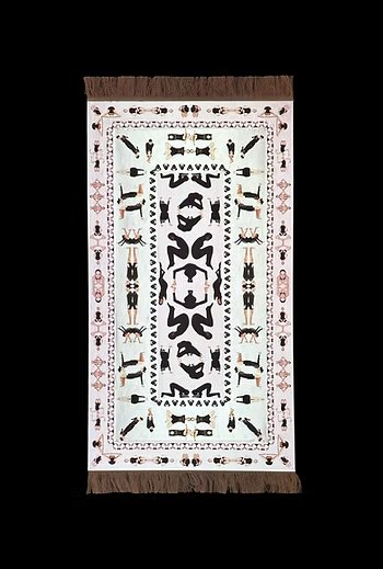 Karanlık odanın bir doğum sürecini temsil etmesi gibi, karanlığın kendisi ise yıkımı ve yeniden doğuşu temsil eder. Meltem Şahin’in kendi bedeniyle ilmek ilmek ördüğü Woven Self isimli dijital kilim çalışması, bir travmanın boyunduruğundan kurtuluşu ve iyileşme sürecini nakşediyor. Sırlarını kilimlere işleyen kadınların geleneğinden ilham alan Şahin, performanslarıyla her motife gizli bir dil kodluyor. Kilimin ortasındaki performansta karanlık bir koza edasıyla üstüne geçirdiği kostümden kilimin kenarında sıyrılıp yeniden doğduğunu görüyoruz.