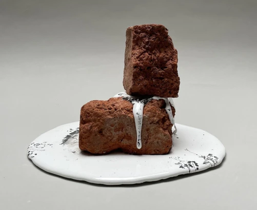 Burçak Bingöl, Brick’s Reverie, 2022, Bomonti Bira Fabrikası enkazından bulunan tuğla ve sır, 16x24x27 cm Ahu Akgün, I Want Them To Live, 2025, Tuval üzerine yağlı boya, 120x70 cm