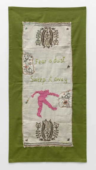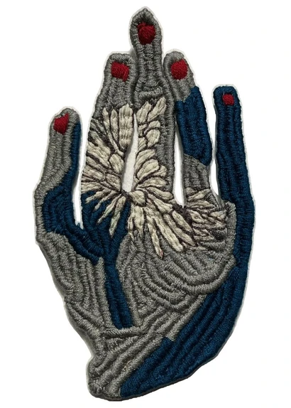 Örme eyleminin onarıcı kuvvetini Nancy Atakan’ın aile yadigârı el işi bir beze nakşettiği Fear is Dust eserinde de görmek mümkün. Atakan kadınlığa dair olumsuz kavramları miras almayı reddeder ve “Korku, tozdur. Süpür gitsin,” der. Hilal Polat Hand Series ile onarımın ve dönüşümün kalbi olan ele odaklanır. “Medeniyetler var etme”[4] gücüne sahip ellerimizin betimlendiği 21 parça örgü işi el serisi hem bütünüyle bakıldığında dayanışmayı simgeler, hem de her elin kendi içinde bir bütün olma halini.