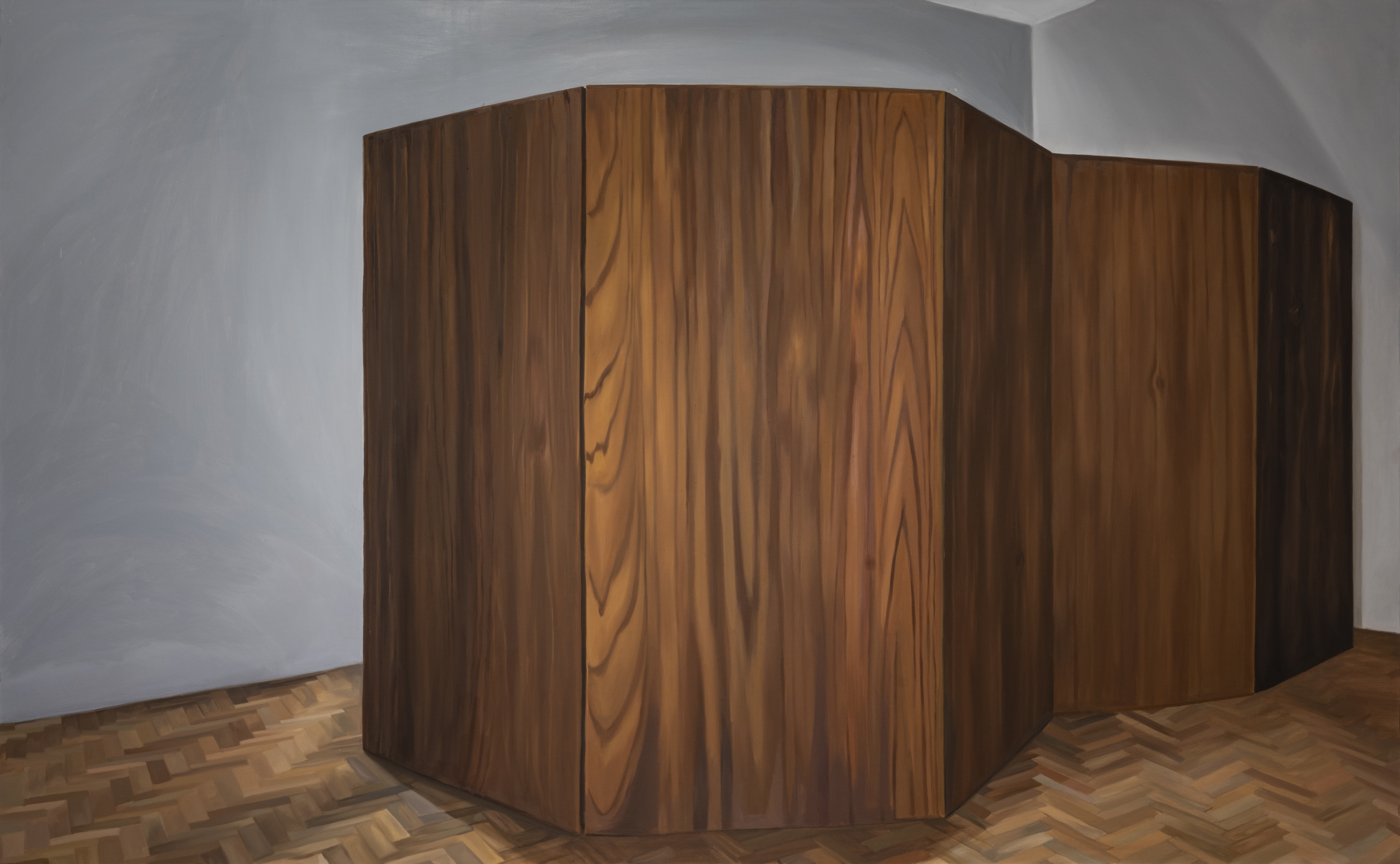 Pandemi döneminde kaldığım oda benim aynı zamanda ergenlik ve erken yetişkinlik çağımın bir kısmının geçtiği odaydı. Bu odada değişmeyen şey devasa köşe dolaptır. Belki başka odada olsa bu kadar büyük algılanmayacak olan gardırop odanın da küçüklüğüyle olduğundan daha da devasa algılanıyor ve pandemi yasaklarının hissettirdiği sıkışıklık hissini daha da arttırıyordu. Yıllardır dolabın üzerinde duran, tahminimce bir gençlik dergisinden çıkan ve üzerinde “Bugün ve her zaman kendime güveneceğim” yazan etiketi oraya yapıştırmamın nedeni bu karşısında insanın küçük hissettiği nesneye bir cevap olabilir diye düşünüyorum. Dolayısıyla bahsi geçen resmi L biçimde bir dolap gibi değil de izleyicinin üzerine doğru giden bir paravan biçiminde yapmamın nedeni söz ettiğim etkiyi görselleştirmekti. Bu görselleştirmeyle bir süredir odak noktam olan resmin fiziksel etkisine başka bir boyut kazandırmıştır.