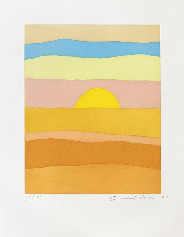 In the exhibition, I selected works by Lebanese artists who illustrate the duality of the sun as described by Adnan in her book of poetry The Arab Apocalypse written in 1975. The black sun is destructive, it’s Samas, the Sun God, who punishes, burns and leads to wars. The yellow sun is this warm planet that feeds our earth and creates the most beautiful colors at sunset. We find in the exhibition works that are in dialogue with a few of Adnan’s obsessions, the sun, the moons, the mountains and the sea. There are new productions such as the two aquarelles by Simone Fattal, the film by Lamia Joreige and the photographs by Buchakjian. These two suns are in conflict and translate the love and hate relationship, us Lebanese have with Beirut.