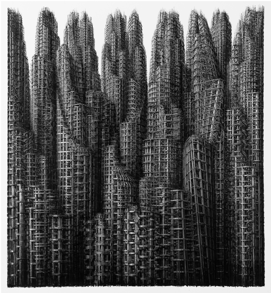 Şimdiye kadar bahsettiğim işlerde İpek’in insan-dışı (ya da öncesi) varlık haliyle teması söz konusuydu. Construction Regime - Building Porn adlı serideki işler ise insan müdahalesinin ‘pornografik’ derecede hissedildiği inşa manzaraları içeriyor. Bu manzaraları kelimenin metaforik anlamıyla birer ‘natürmort - ölüdoğa’ olarak görmek mümkün. Yukarıda bahsettiğim ‘varlığın nefes alan hali’nin hiç olmadığı, varlık ya da doğa için bir nefes alma ihtimalinin kalmadığı bir istila manzarası bu. Binaların resmedilişindeki inanılmaz detaycılık da manzaralardaki boğuculuğu arttırıyor. Piranesi’nin 18. yüzyıldaki bina çizimlerinin ‘cehennemsi mimarisi’ni burada da hissetmek mümkün. Bir diğer 18. yüzyıl ‘cehennem çizeri’ Goya’nın Kara Resimler’indeki grotesk hava da burada belli belirsiz hissediliyor. Sözde rasyonel bir temele dayanan mevcut inşa faaliyetinin ulaştığı ‘irrasyonel’ ve ‘grotesk’ seviyeyi göstermek, politik açıdan gayet önemli. Doğanın jungle’larını ‘uygarlık’ adına yok eden insanların, kendi yapay-bina-jungellarını üretmeleri, aydınlanma retoriğinin nihayetinde Nazizme kadar uzanan bir müdahaleyi üretmesine paralel bir şey: Aydınlanma’nın rasyonelliğinin içinde ‘irrasyonel’ denetim çabası nasıl politik bir cehenneme yol açtıysa, ‘aydınlanma’ romanı Robinson Crusoe’dan bu yana uygarlık inşası da bir cehennem manzarası yarattı.