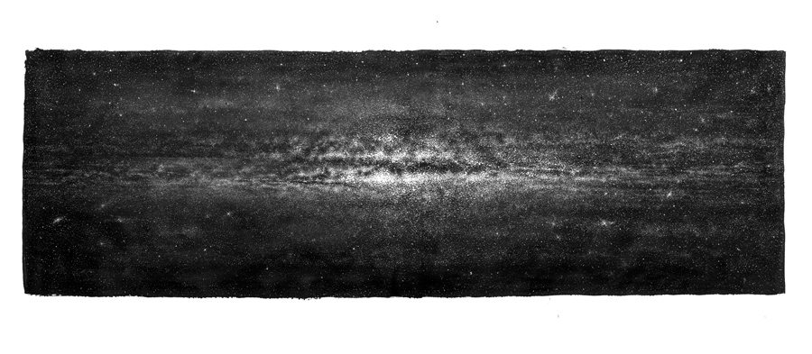Stars, Hint mürekkebiyle kaplanmış kağıt üzerine kazıma, 125 x 360 cm, 2017