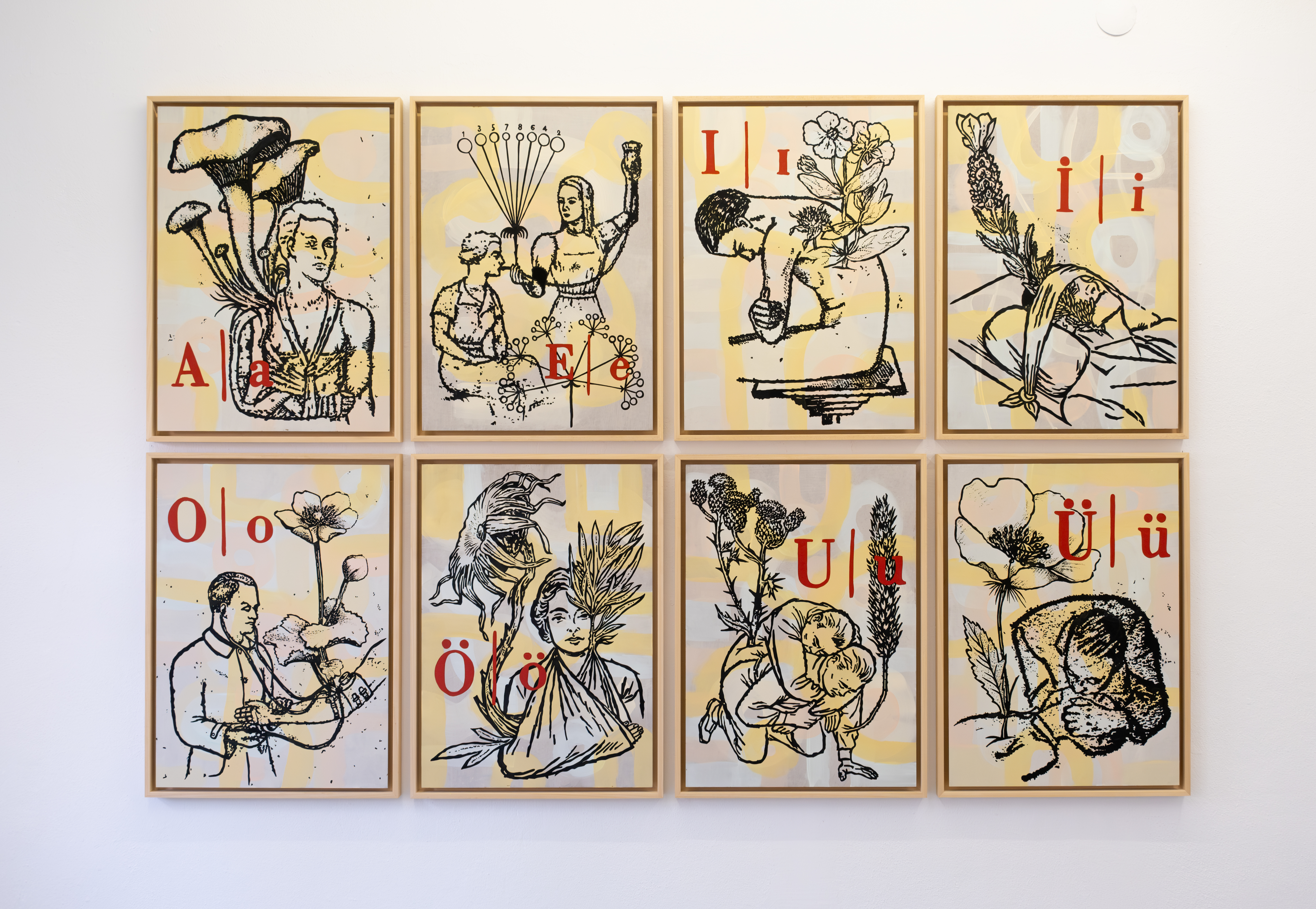 Memed Erdener, Her Kaza Bir Mucizedir, 2024, 8 adet kontrplak üzerine akrilik / herbiri 50x70cmSanatçı ve Zilberman Gallery’nin izniyleÜniversite yıllarımın en etkileyici figürlerinden Dominique Desmarchelier’nin hayatıma zerk ettiği dilbilimi alanı ve Ferdinand de Saussure'ün gösterge kuramı (gösteren ve gösterilenden oluşan keyfi (arbitraire) ilişki) açısından bakarak soruyorum: Sesli harflerin anlamın oluşumundaki rolünü nasıl değerlendiriyorsunuz? Çalışmalarınızda harfleri yalnızca fonetik unsurlar olarak ele almadığın, onlara sembolik ya da yapısal işlevler de yüklediğini söylersem doğru olur mu? Bu doğrultuda dilin sınırlarını genişleten bir öneri getirdiğini söyleyebilir miyim? (Bu çok heyecan verici.) Dilde “yeni”yi biyolojide ararken dilin evrim süreciyle de ilişkilenebilir miyiz?