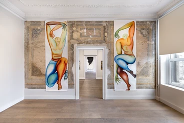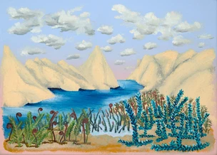 Solda: Camila Rocha, İlk Bitkinin Dünyadaki Manzarası, 2024, Tuval üzerine akrilik ve yağlıboya, 18 x 25 cm, Sanatçının ve Öktem Aykut’un izniyle Ortada: Anousha Payne, Yükselen Ev (Pareidolia), 2024, Keten bez üzerine üzerine suluboya ve akrilik cila, 120 x 140 cm, Sanatçının ve Sperling’in izniyle. Sağda: Jen Hitchings, 24 Saat (Yellowstone, Devedikenleriyle), 2024, Panel üzerine yağlıboya, 61 x 91,5 cm, Sanatçının ve Taymour Grahne Projects’in izniyle
