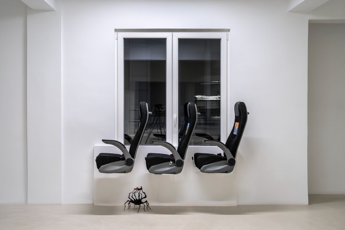 Deniz Kulaksızoğlu, umarım daha gelmemize vardır, 2024, servis koltukları, tuval üzerine yağlı boya,3d print örümcek (pla), 22 senelik spider man oyuncağıServiste, alacakaranlıkta, motordan gelen mazot kokulu havayı içeri üflemekten başka bir halta yaramayan kaloriferin mide bulandırıcı sıcaklığında, radyodan yayılan dandik müzik eşliğinde, okula varmama on küsur dakika kala hayal kuruyorum. Peugeot J9 minibüsün, üzerindeki desenlerin hangi akla hizmet tasarlandığını halen bilemediğim gri ve mavi, ziyadesiyle kirli, haddinden fazla ergonomik yine de hiçbir şekilde sempatik olmayan koltuklarının üzerinde iğreti oturmuş, hayal kuruyorum. Atlar, çayırlar, mavi gökyüzü, özgürlük. Hepimiz mi bu hayali kuruyoruz? Muhtemelen bu hayal de sınai bir üretim. Ama hayal kurmak güzel. Hayal kurmak neyin hayalini kurduğundan bağımsız özgürlüğün ta kendisi. Peki gri ve mavi koltuklar da benimle aynı hayali mi kuruyor? Onların da mayasında özgürlük var mı?