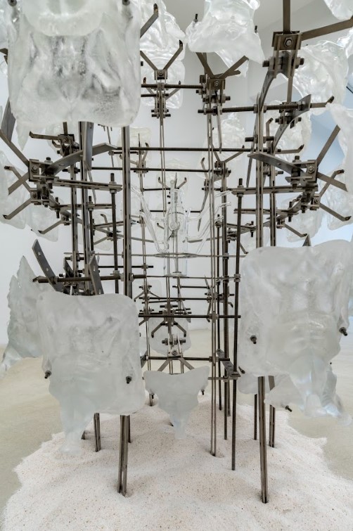 Deniz Kulaksızoğlu, utangaç ama olsun (susamak gibi), 2024,paslanmaz çelik, epoksi, cam mutant şişe, beyaz kum