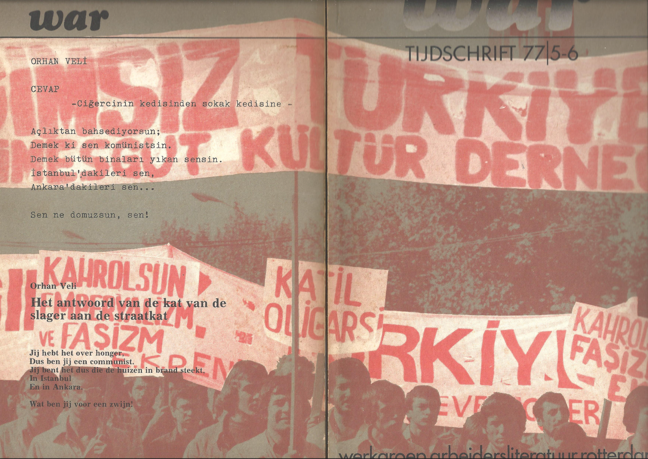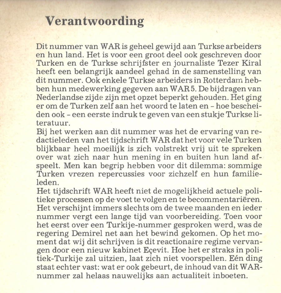 Tezer Özlü'nün Çevirilerini üstlendiği WAR Dergisinin ön ve arka kapağıWAR,1970’lerde hemen hemen her Batı Avrupa ülkesinde tartışılan bir konuya adanmış bir dergi: İşçi edebiyatı. Yanlızca Türkiye’den değil, 1960’lardan itibaren dünyanın dört bir köşesinden Batı Avrupa’ya özel anlaşmalarla gelen göçmen işçiler, Max Frisch’in çok yerinde ifadesiyle tahta bavullarında kendi edebiyatlarını, dünyaya bakış açılarını da getirmişlerdi beraberlerinde. İşte bu işçilerin kısa bir süre sonra hem anadillerinde, hem de geldikleri ülkenin dilinde yazdıkları ''işçi edebiyatı'' olarak tanımlanıyordu. Bu edebiyatın savunuculuğunu üstlenen WAR dergisinin alt başlığı werkgroep arbeidersliteratuurismini taşıyordu. Tezer Özlü’nün bu derginin iki sayısına katkısı olduğunu biliyordum ama Rotterdam’da güzel bir akşamüstü elime geçen dergiye kısaca baktığımda, neredeyse derginin tamamının yükünü üstlendiğini bilmiyordum. Son derece güzel bir tipografiyle yayınlanan dergi, 1977 yılında yayınlanmış. O yüzden Tezer Kiral ismini kullanan sevgili yazarım, hem Nâzım Hikmet’ten Orhan Veli’ye önemli şairlerin ikonik dizelerini Almanca asıllarıyla karşılaştırarak Hollandacaya çevirmiş, hem de De krotten en de 500.000ste gastarbeider isimli bilmediğim bir yazı kaleme almış. Yazının ilk cümlesini tercümeye gerek görmeden anlamanın mutluluğunu yaşarak okumaya başlıyorum: Klein-Azië is groot. Cümleler kısa ama vurucu, tam anlamıyla Tezer Özlü stilini yansıtan akıcılıkta işçi göçünü ele alan bu yazıdaki yorum gücü beni şaşırttı. Neden mi? Bir yıl sonra, 1978’de İstanbul’daki Goethe Enstitüsü’nde çalışmaya başlayacak olan Tezer Özlü, 1984 ilkbaharına kadar sürecek olan bu görevinde Federal Almanya’daki kültürel hayat üzerine, özellikle de edebiyat, sinema, tiyatro üzerinde Türkiyelilerin izlerini keskinleştirecek projelere imza atmıştı.