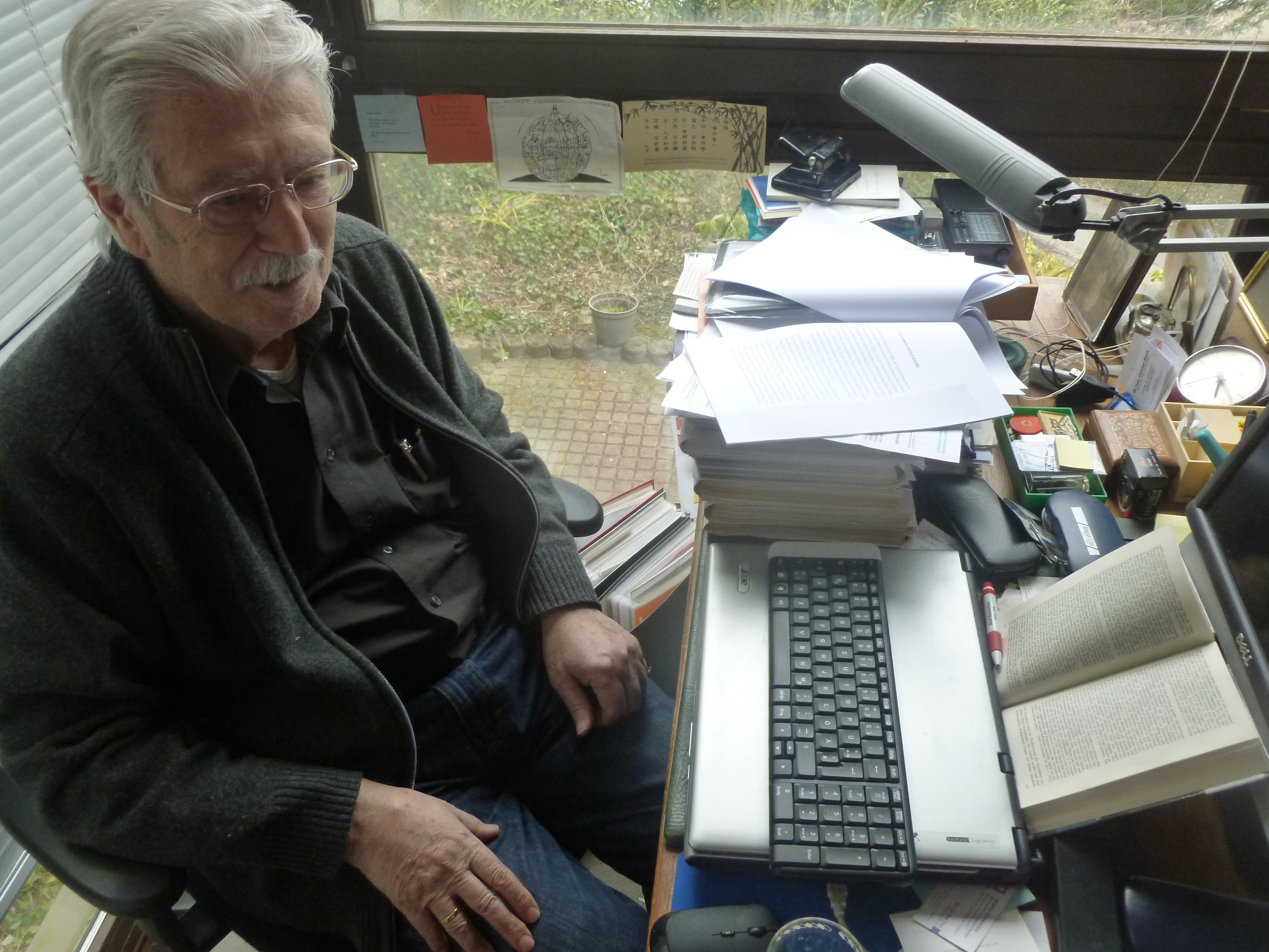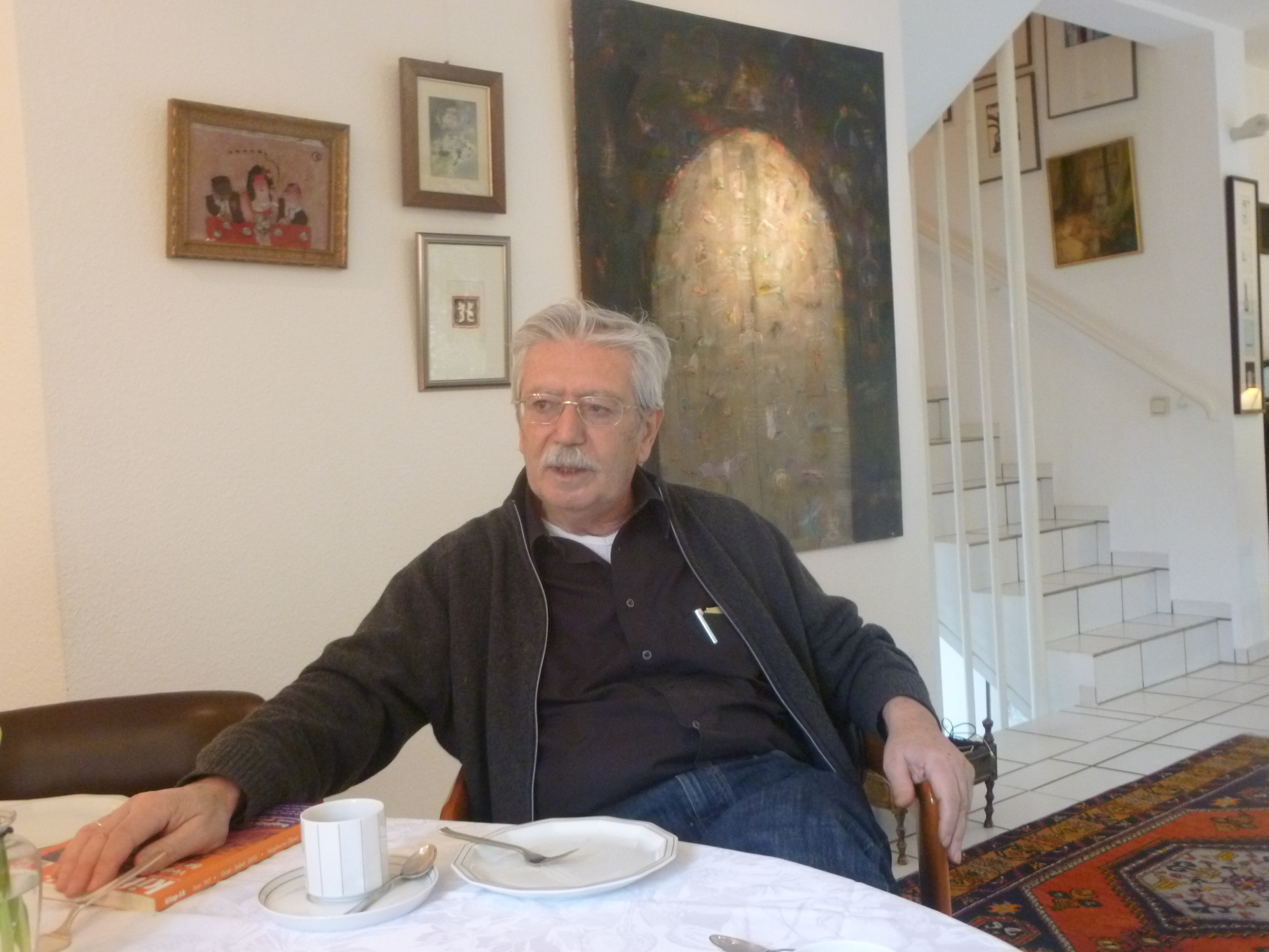 Yüksel Pazarkaya çalışma masasında, 2019, Fotoğraf: Necmi SönmezPazarkaya 1974’te Avrupa’da Türk çocukları için Türkçe olarak basılan ilk derleme Ağaca Takılan Uçurtmayı yayınlarken o yıllarda son derece soyut, monochrome resimler yapan Orhan Peker (1927-1978) ile birlikte çalıştı. Böylece daha sonra farklı ressamlarla da tekrarlayacağı verimli bir sanatsal diyaloğu başlatmış oluyordu. Resim sanatına ve ressamlara olan bu yakınlığı, onlara sağladığı özgür çalışma ortamı hakkında Abidin Dino’nun bana söylediklerini hiçbir zaman unutmam mümkün değil. Dino Pazarkaya’yı ressamların çilesini bilen bir “dost derviş” olarak görüyordu.