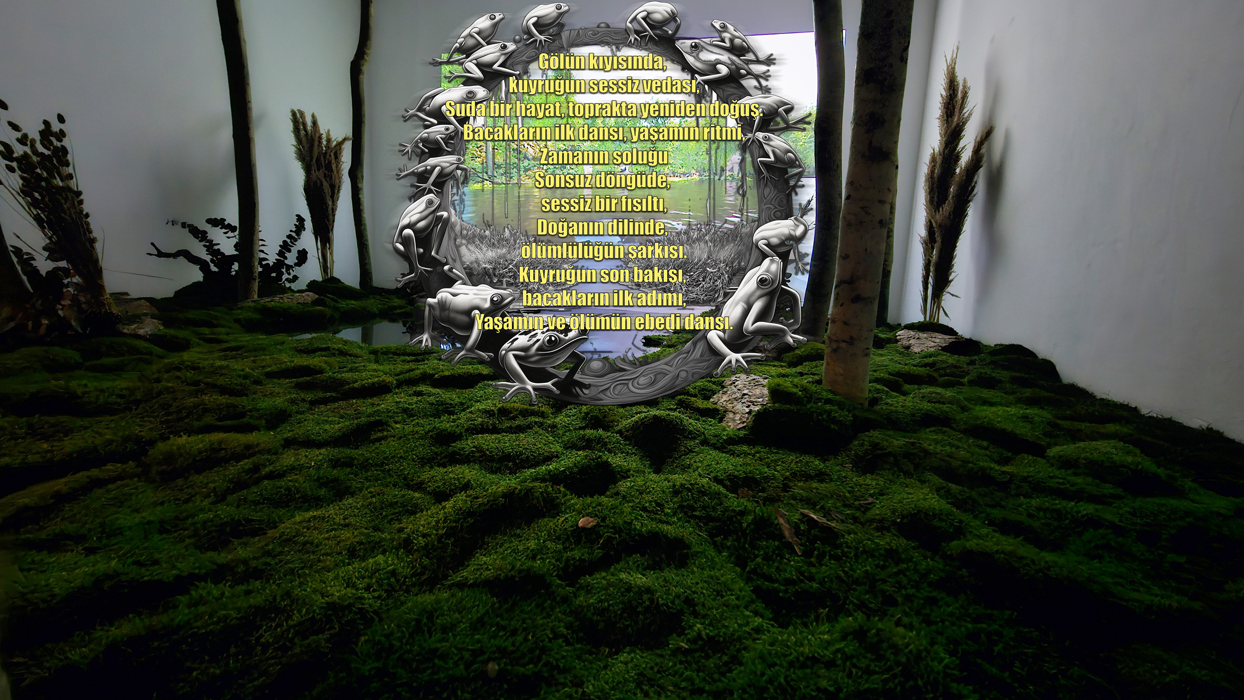 Mitolojinin dışında doğada da metamorfoz en çok kurbağalarda görülen bir özelliktir. Yani, doğumundan ölümüne uzanan süreçte çeşitli evrimlerden geçip orijinal halinden farklı bir canlıya dönüşen kurbağalar belki de kocaman bir tiyatro sahnesi olan dünyamızın başrollerinden birini oynuyor olabilir. Theatrum Mundi – In the Pond isimli mekâna özel interaktif yerleştirmede Ahmet Rüstem ve Hakan Sorar’ın değişime uğrayan siluetlerine ChatGpt4 ile yazılan bir şiir eşlik ediyor. Geleneksel şiir formundan uzak olan bu chatbot şiiri Japon haiku ustası Başo’nun Kurbağa dizelerini anımsatıyor: